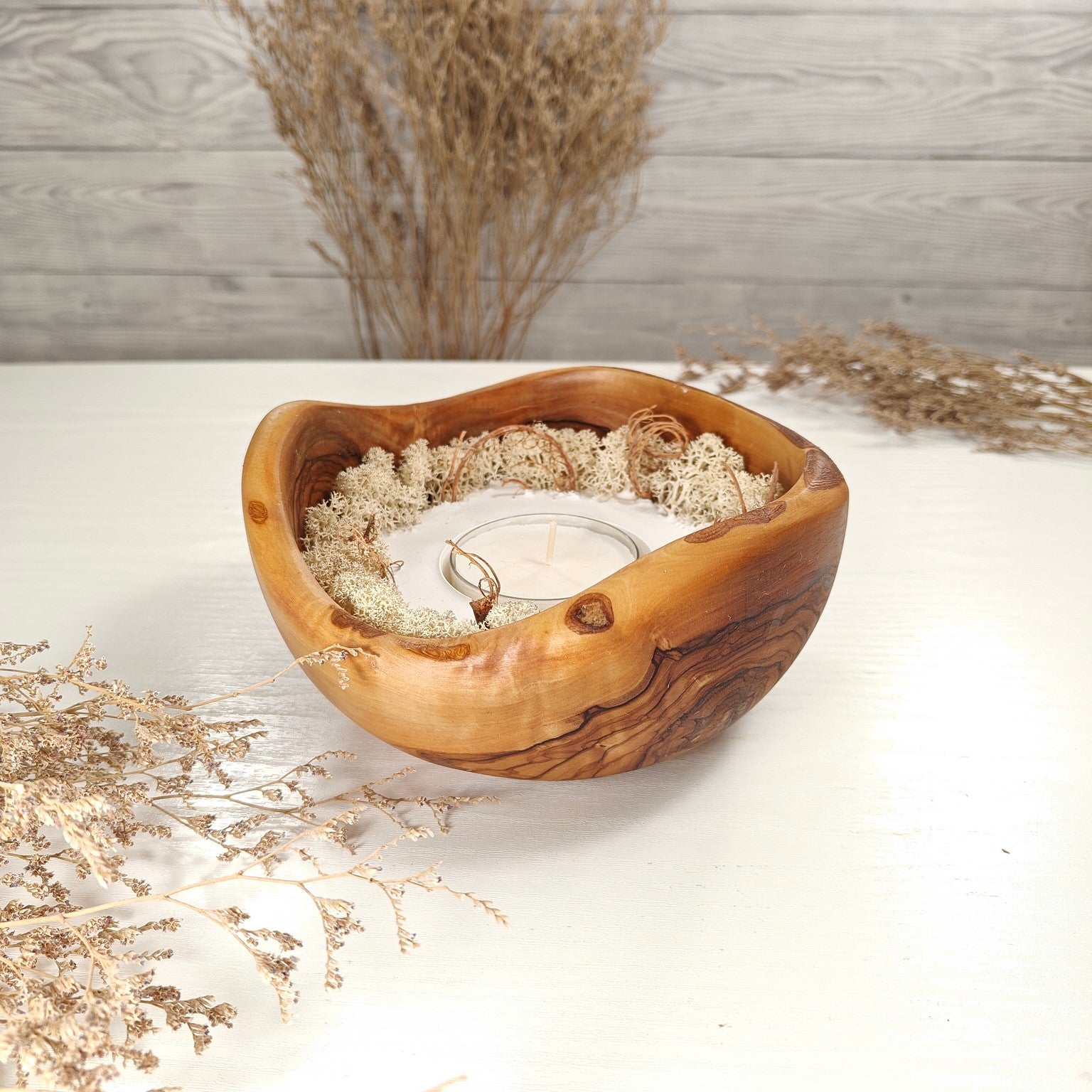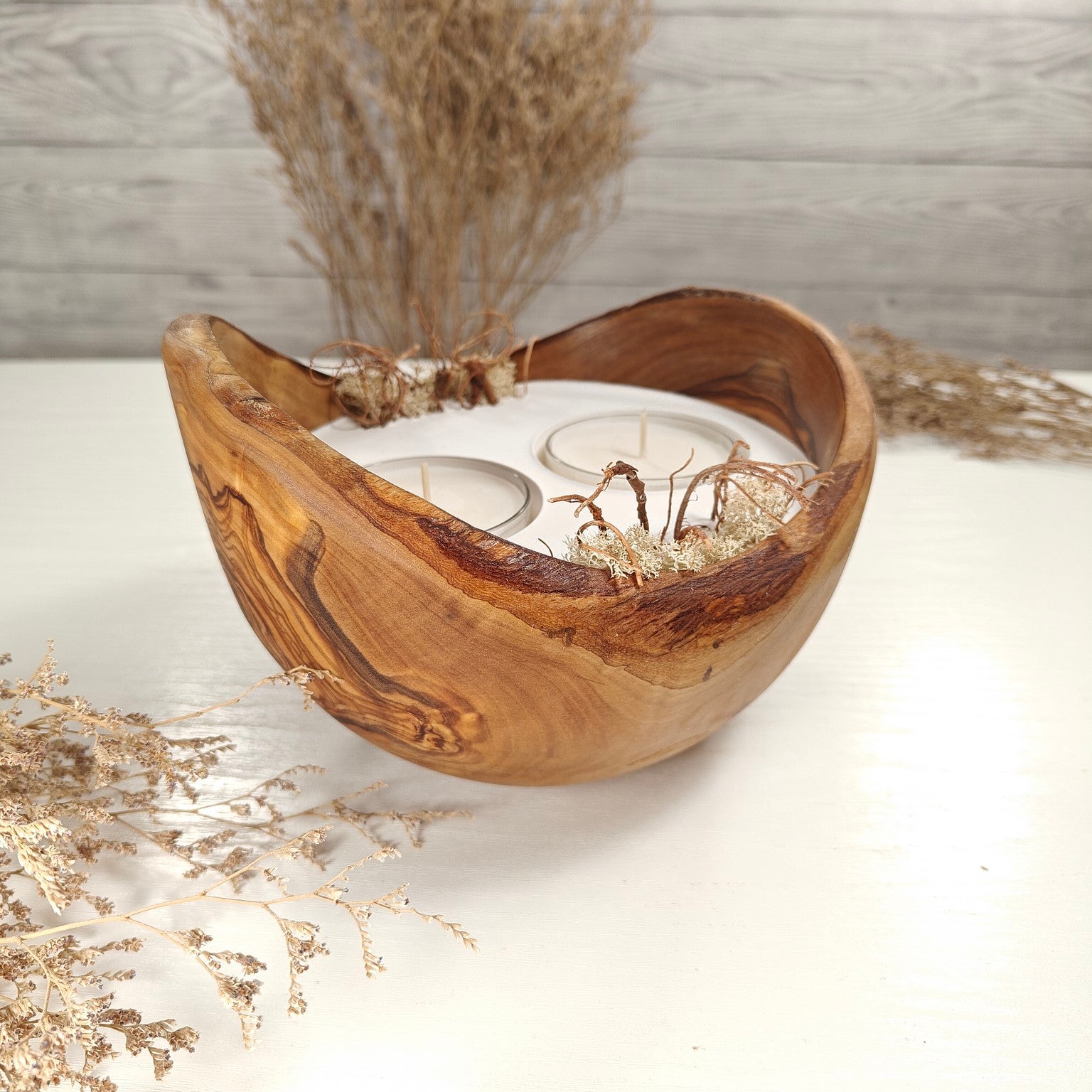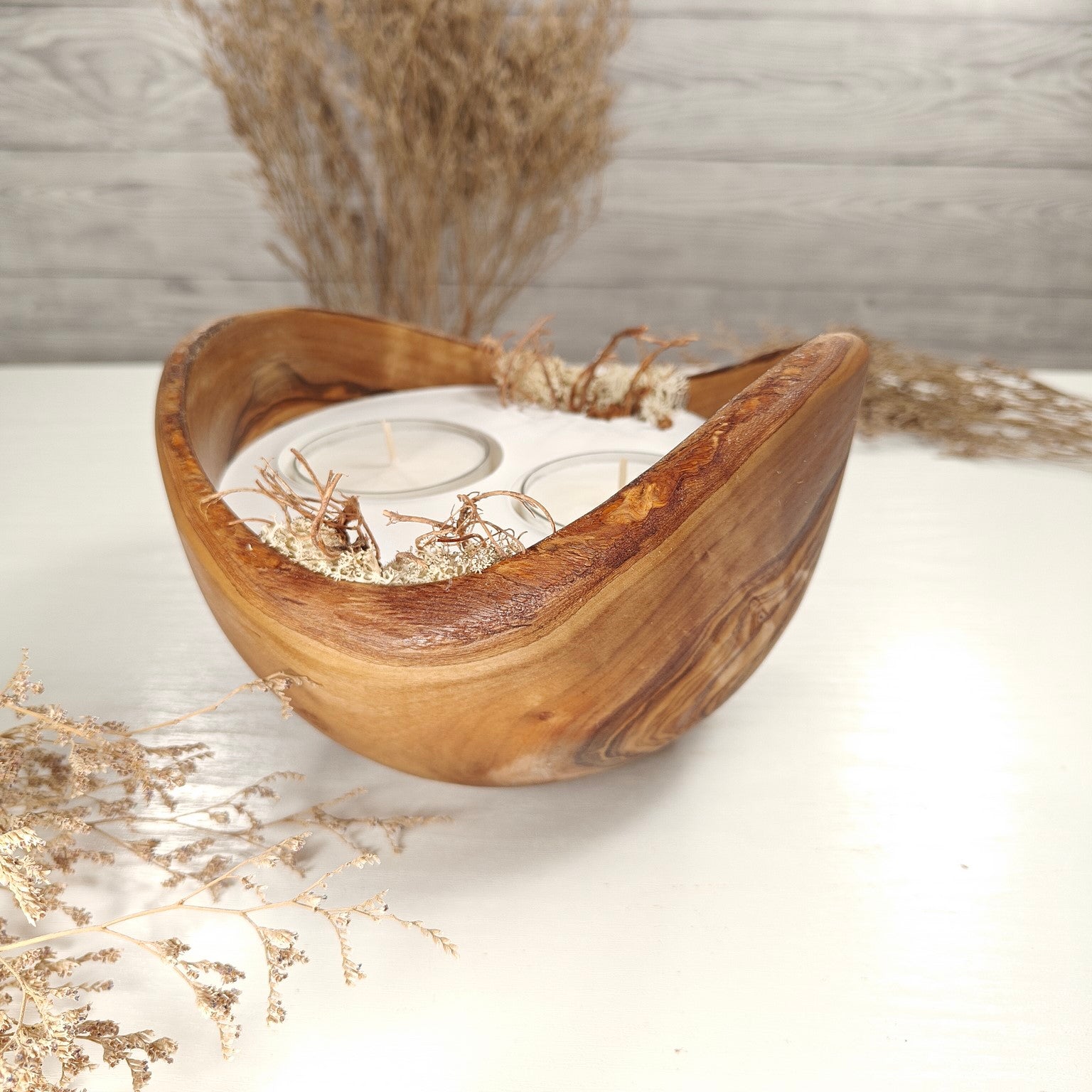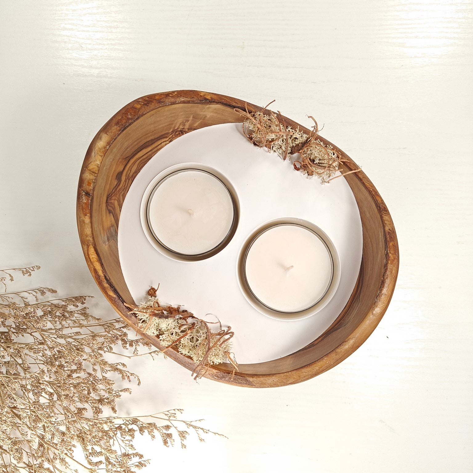 Unsere Olivenholzschalen für Teelichter sind die perfekte Geschenkidee.  Das charaktervolle Olivenholz, verbunden mit weissem Guss-Keramik ergibt einen schönen Farbkontrast und lässt die Kerze durch die weisse Fläche noch heller erscheinen. Jede Kerze ist ein Unikat und einzigartiges Geschenk.