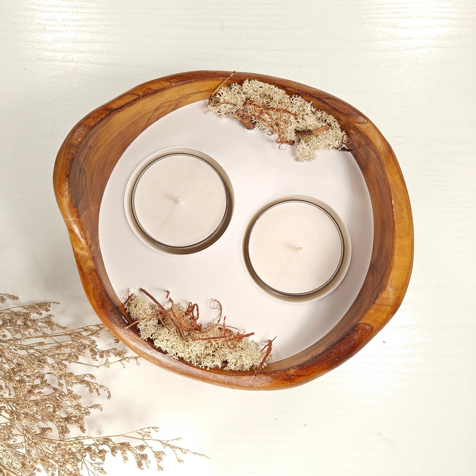 Unsere Olivenholzschalen für Teelichter sind zu Beginn mit einem Teelicht ausgestattet. Hierfür nutzen wir reine Rapswachs-Teelichter.