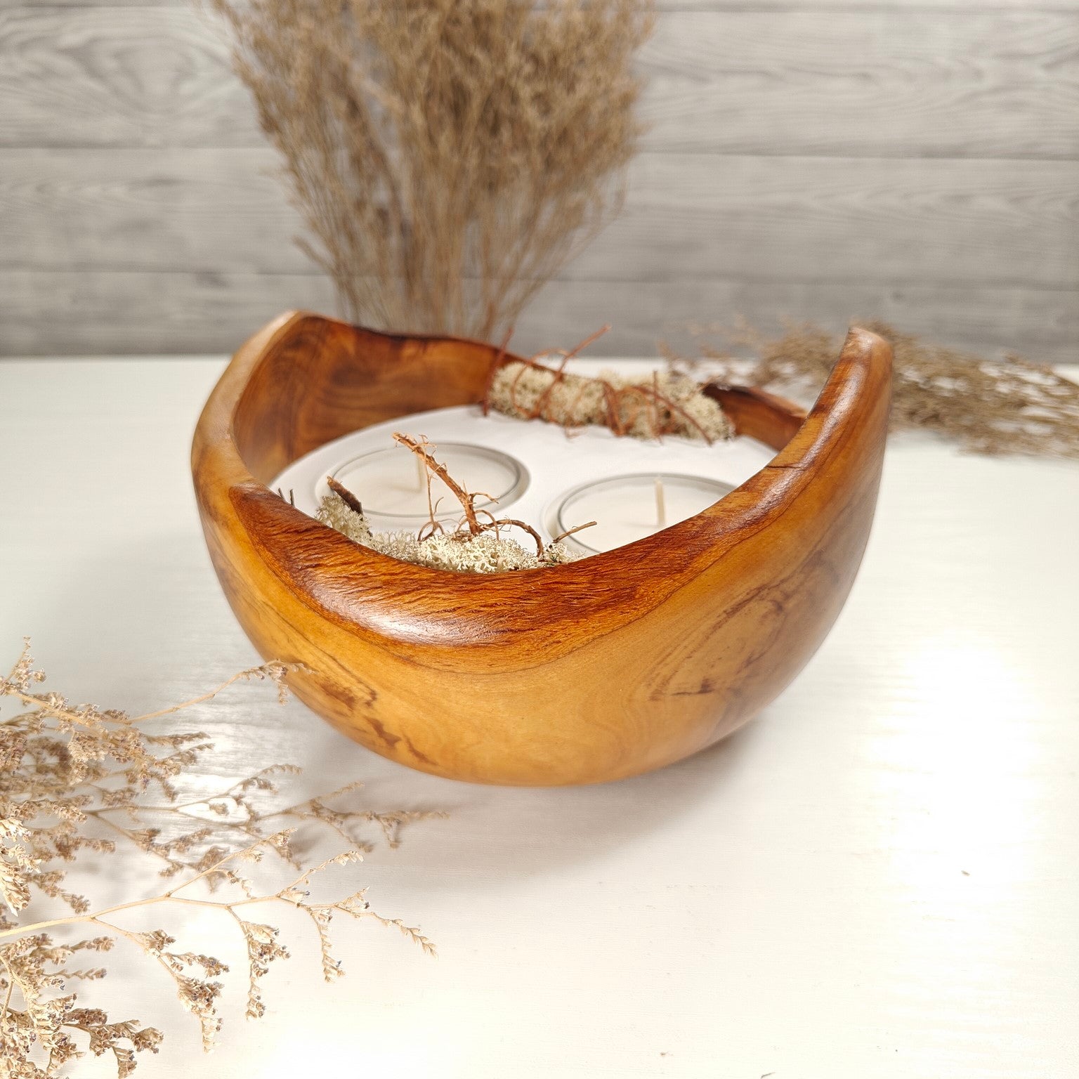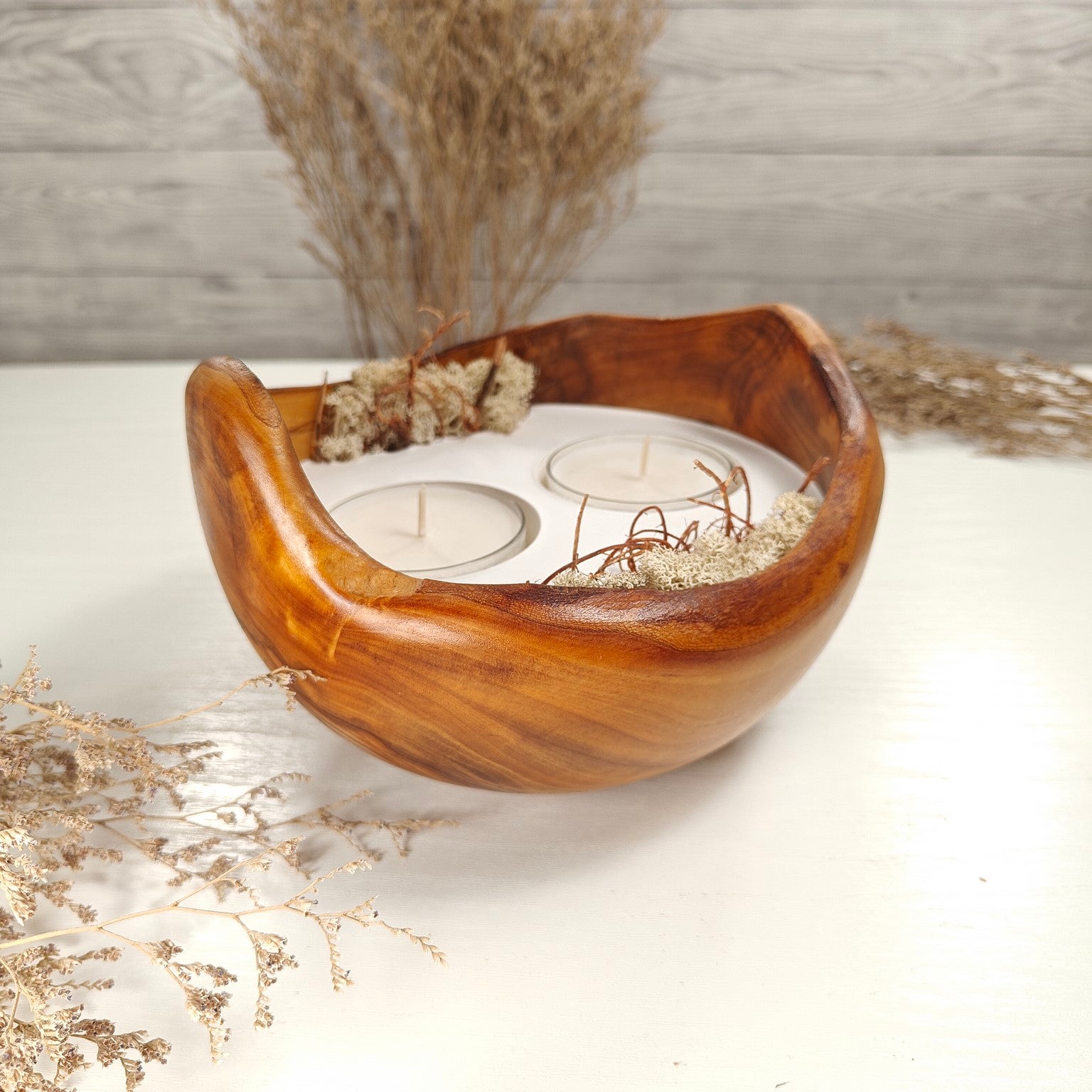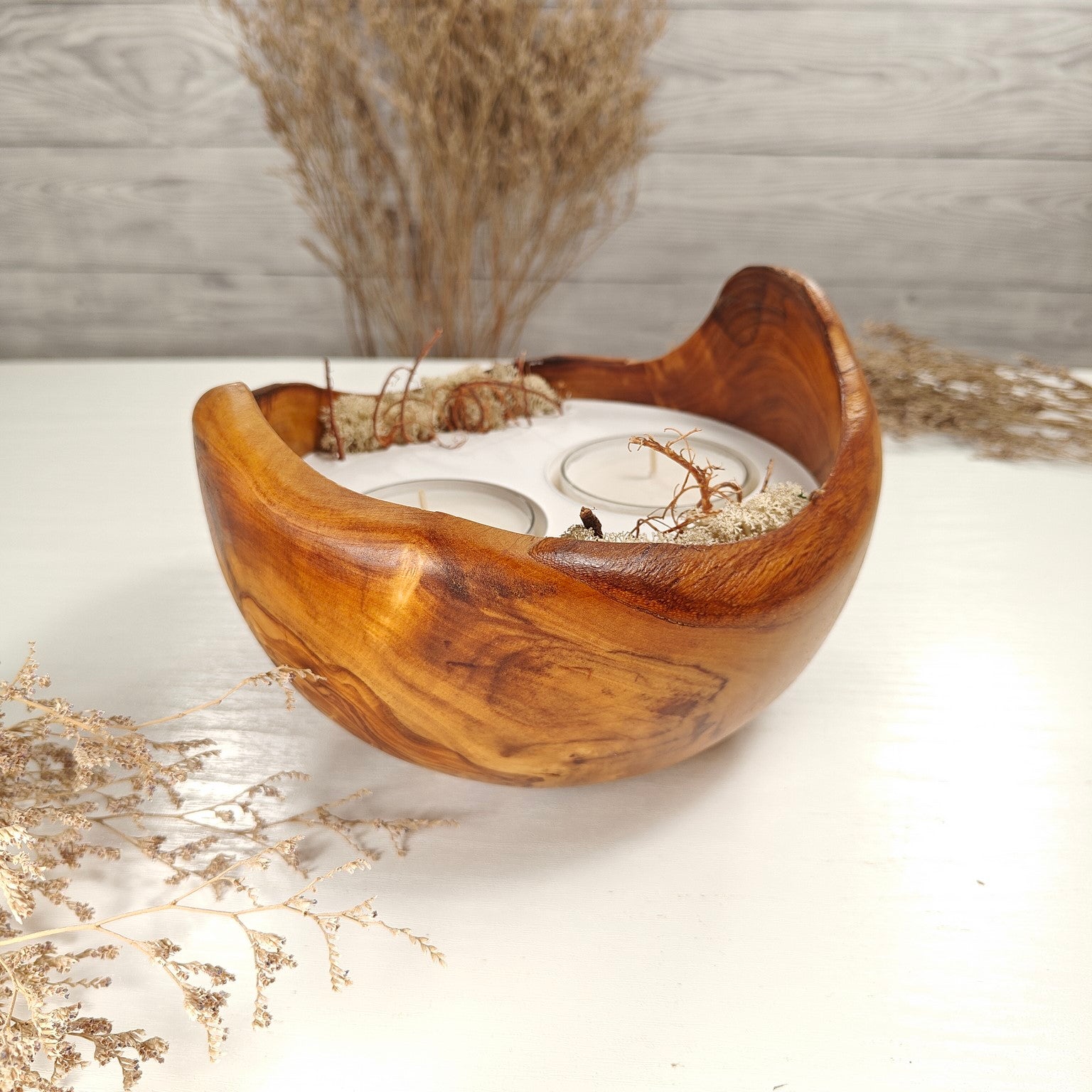 Unsere Olivenholzschalen für Teelichter sind die perfekte Geschenkidee.  Das charaktervolle Olivenholz, verbunden mit weissem Guss-Keramik ergibt einen schönen Farbkontrast und lässt die Kerze durch die weisse Fläche noch heller erscheinen. Jede Kerze ist ein Unikat und einzigartiges Geschenk.