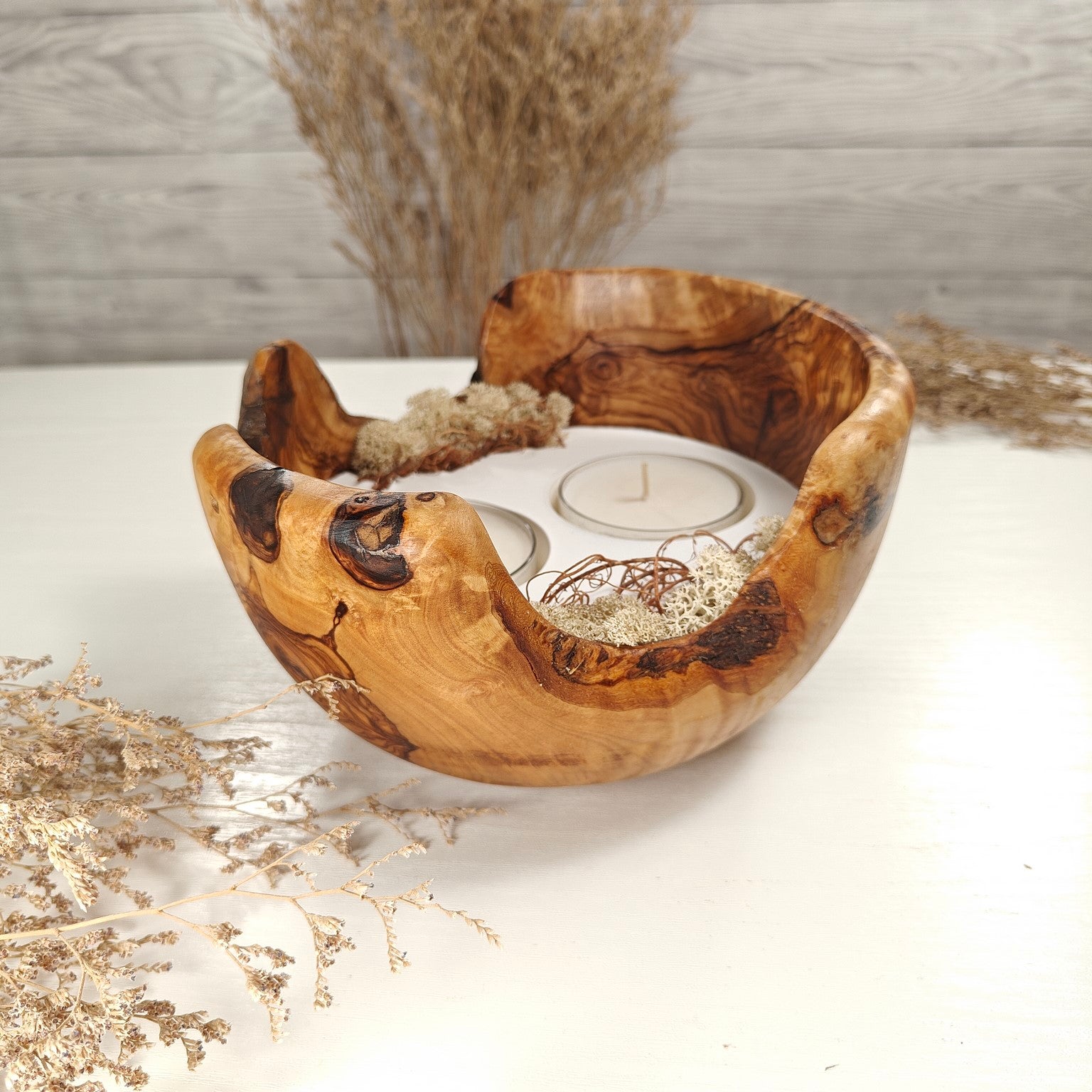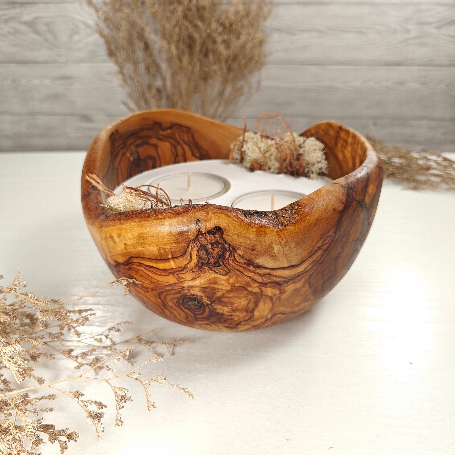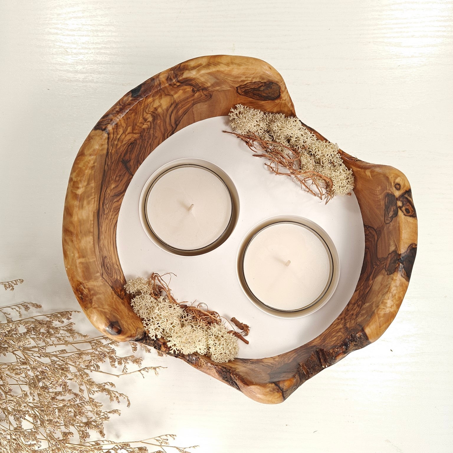 Unsere Olivenholzschalen für Teelichter sind die perfekte Geschenkidee.  Das charaktervolle Olivenholz, verbunden mit weissem Guss-Keramik ergibt einen schönen Farbkontrast und lässt die Kerze durch die weisse Fläche noch heller erscheinen. Jede Kerze ist ein Unikat und einzigartiges Geschenk.