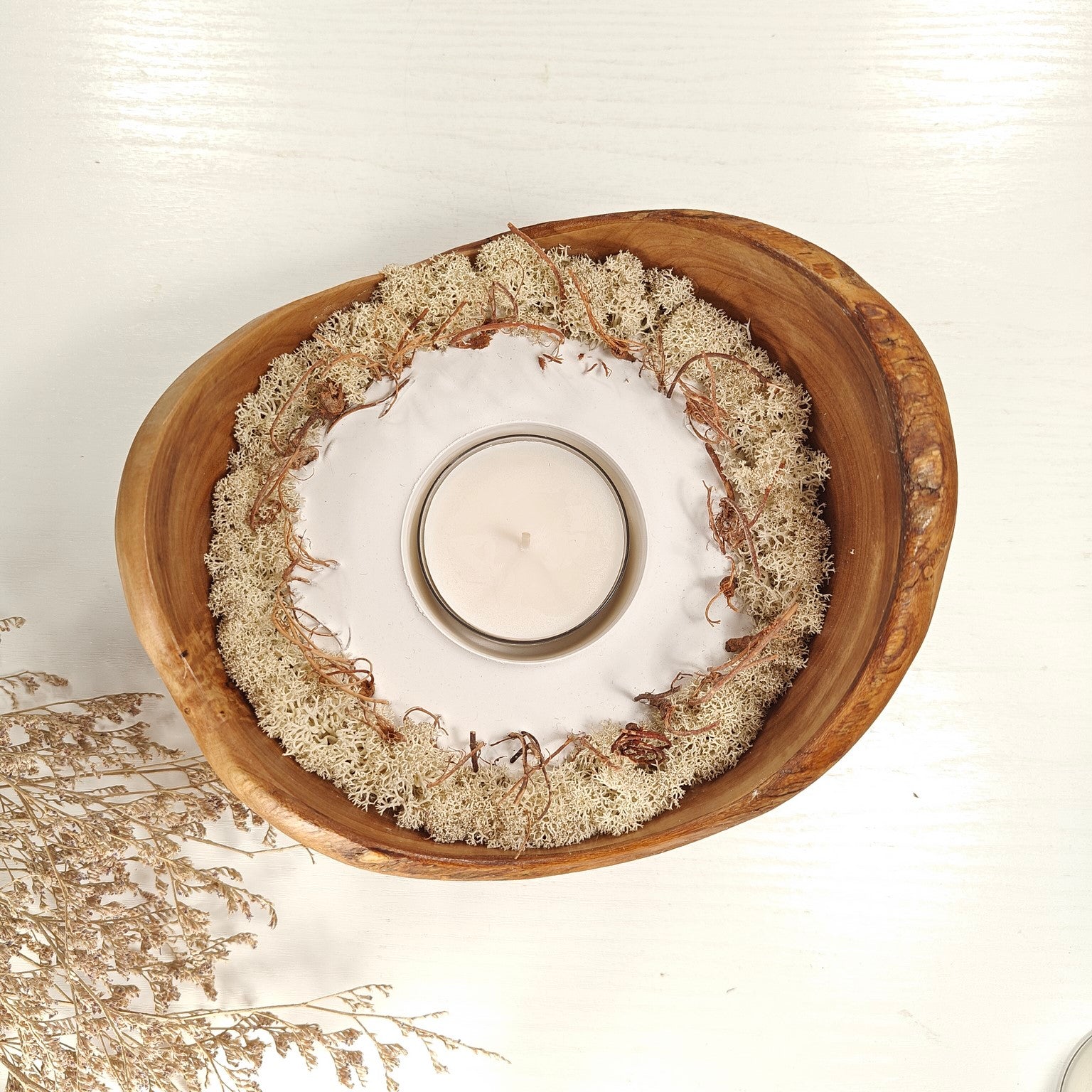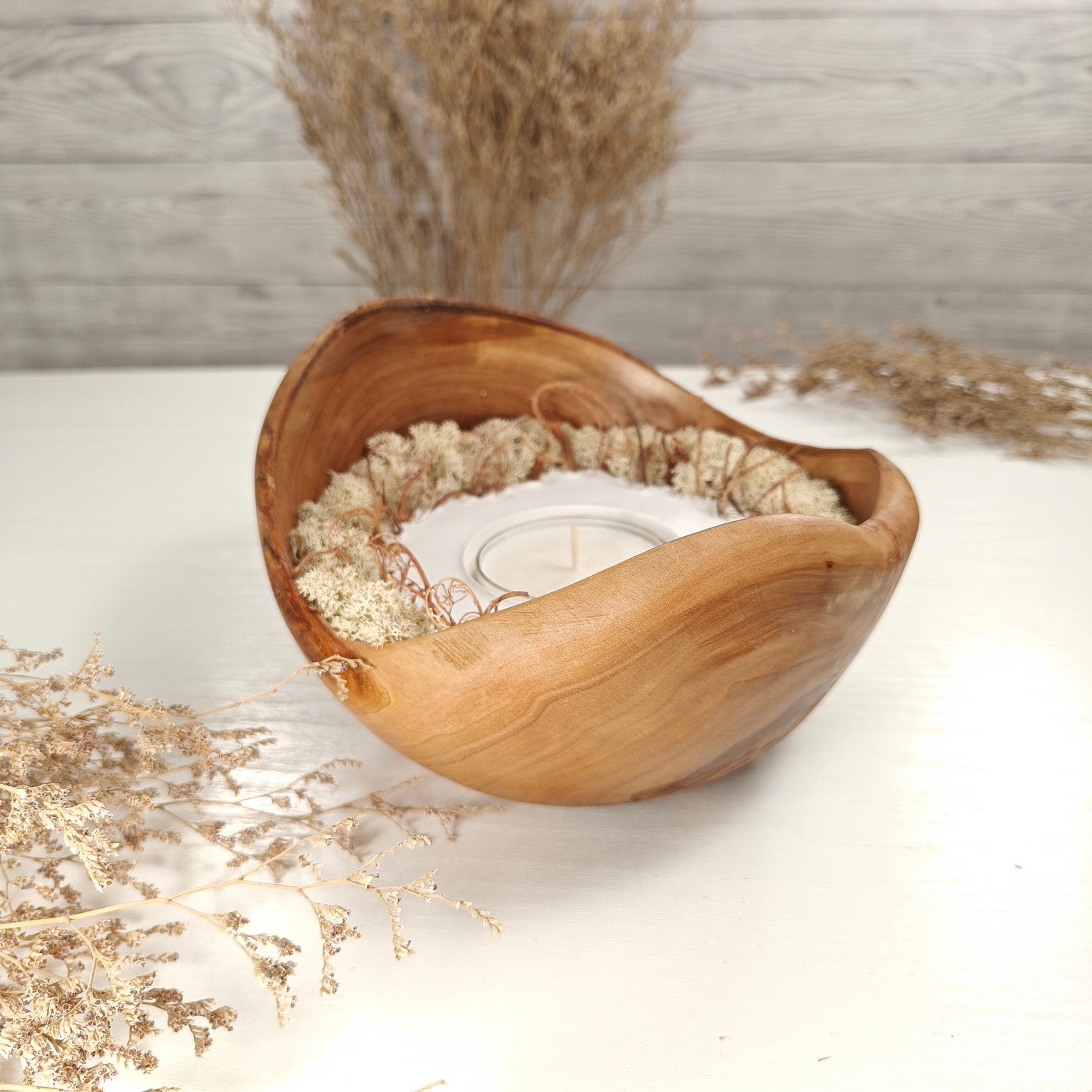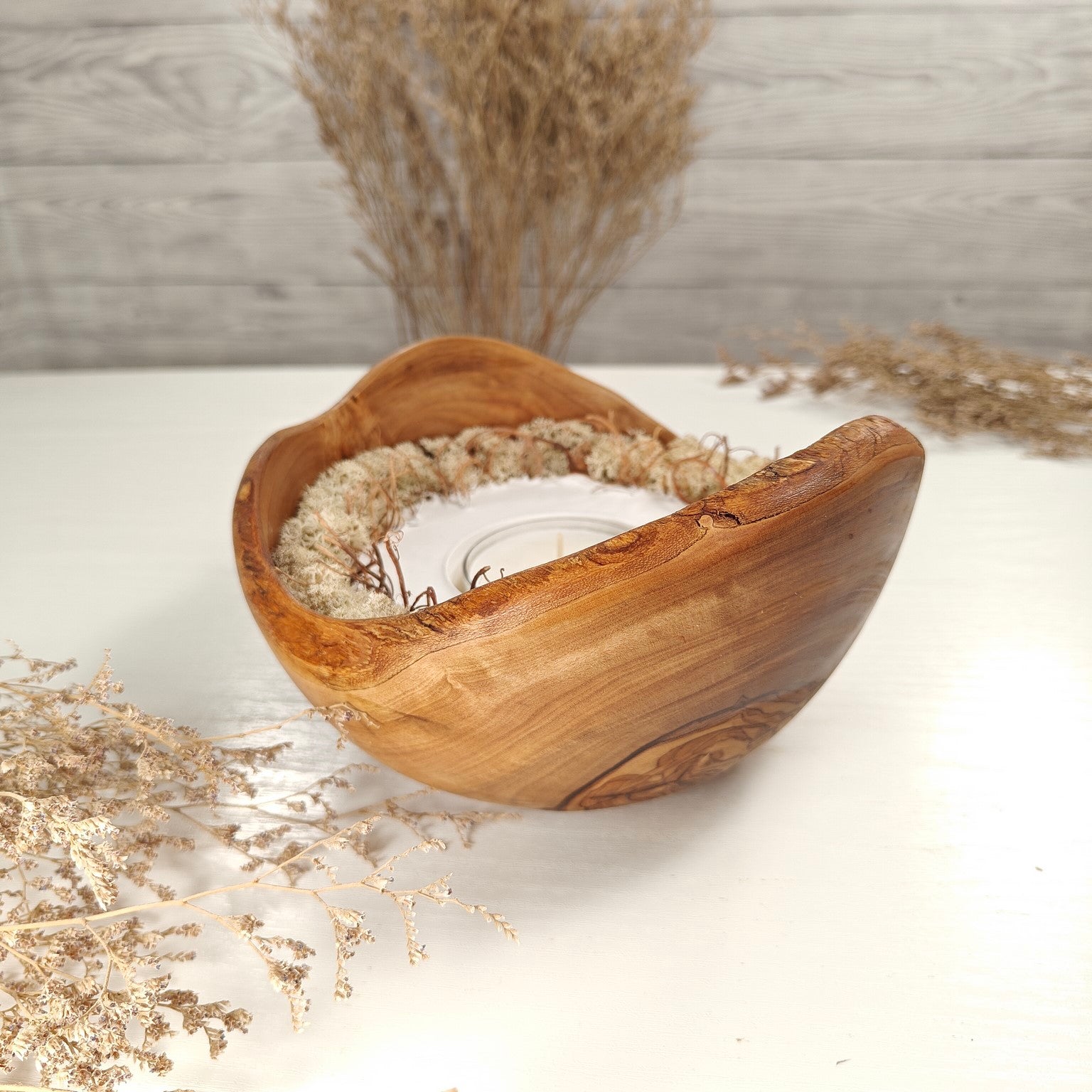 Unsere Olivenholzschalen für Teelichter sind die perfekte Geschenkidee.  Das charaktervolle Olivenholz, verbunden mit weissem Guss-Keramik ergibt einen schönen Farbkontrast und lässt die Kerze durch die weisse Fläche noch heller erscheinen. Jede Kerze ist ein Unikat und einzigartiges Geschenk.