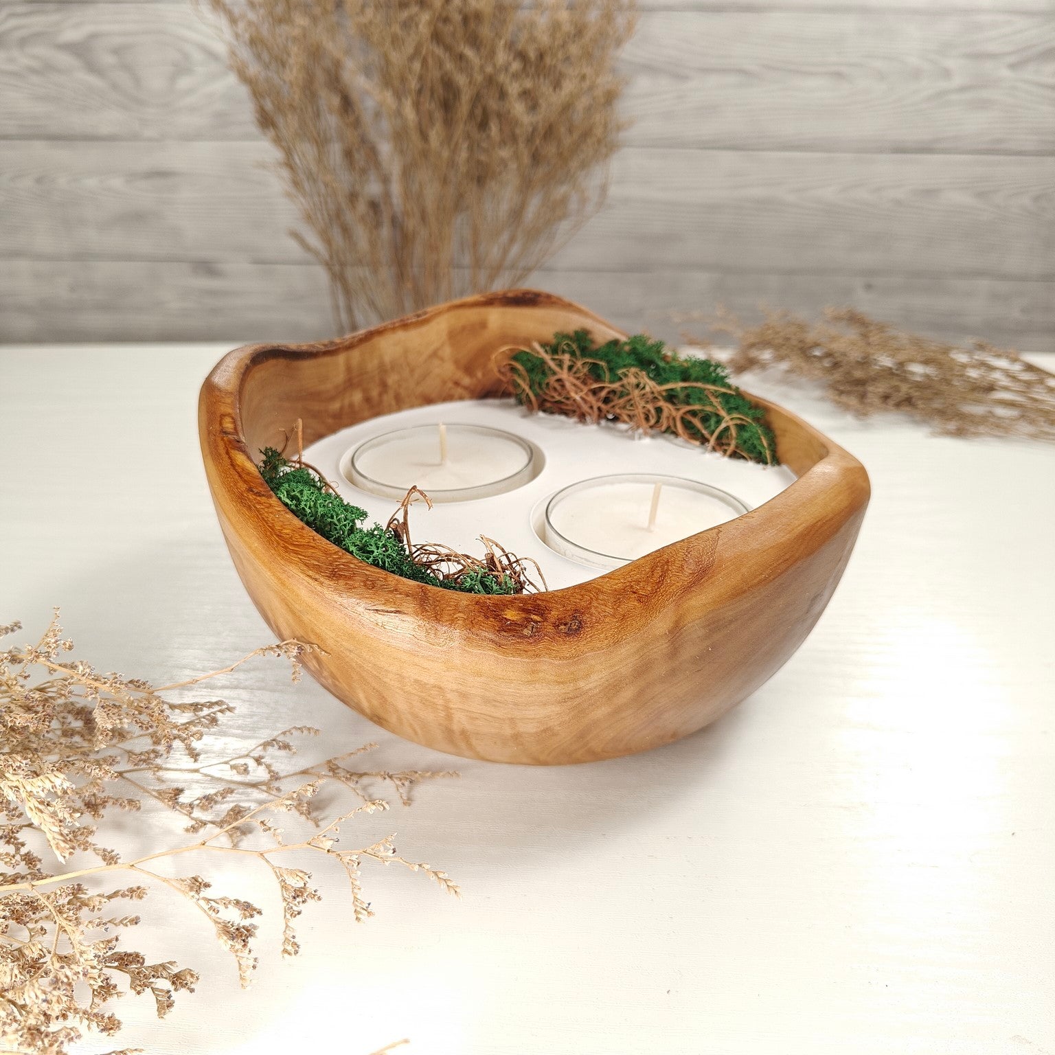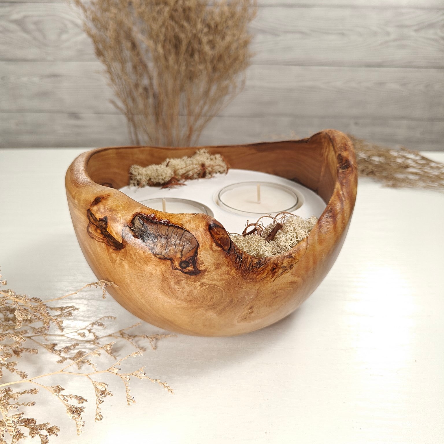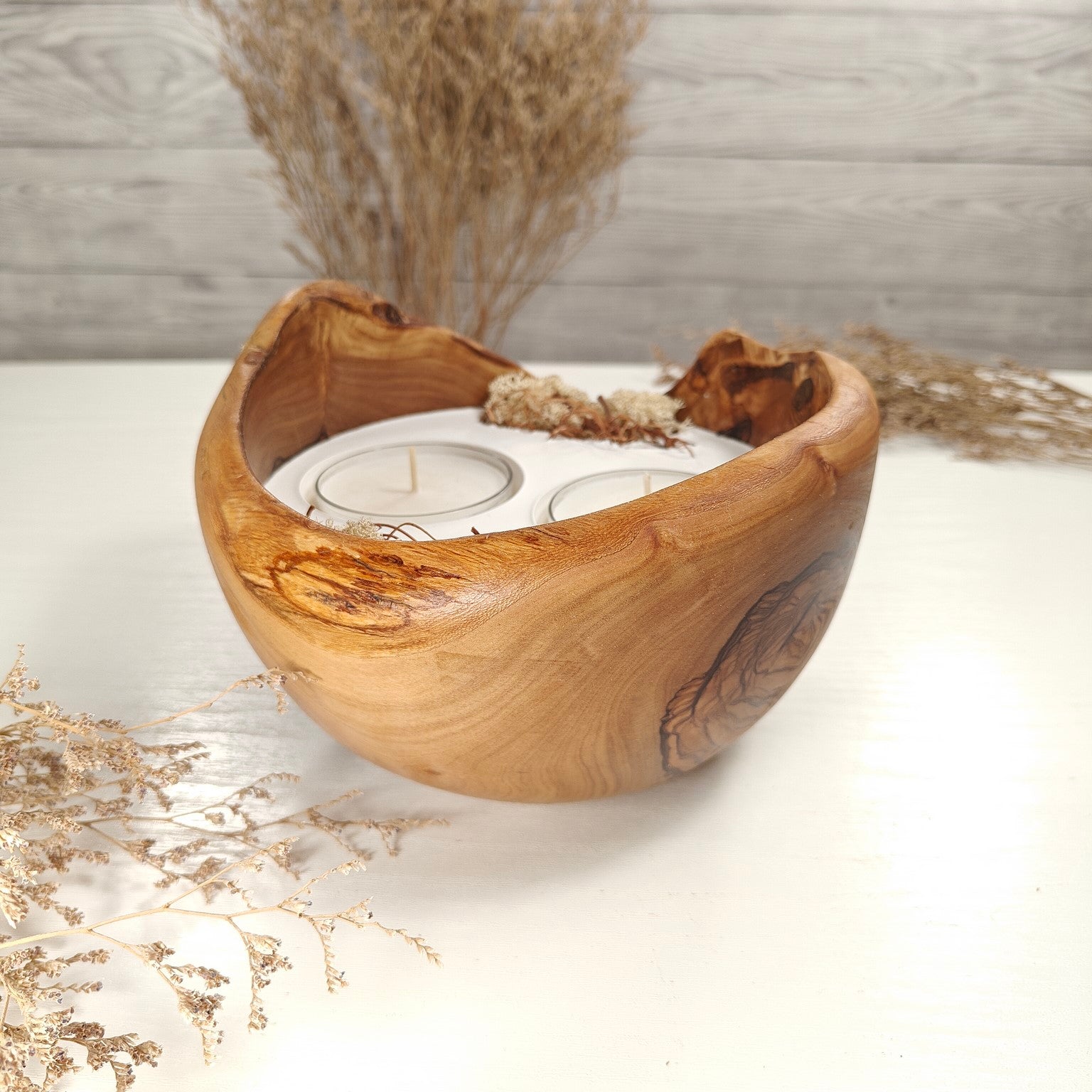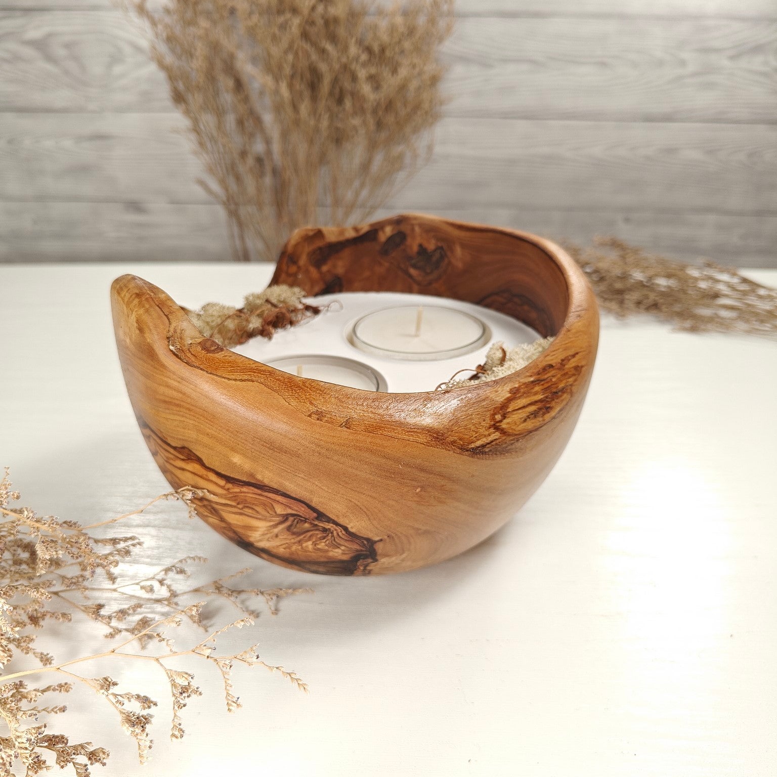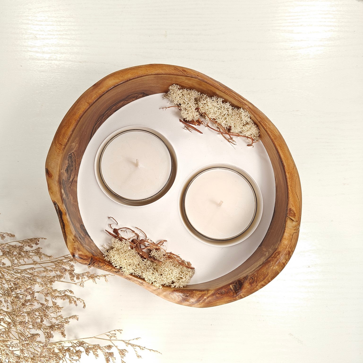 Unsere Olivenholzschalen für Teelichter sind die perfekte Geschenkidee.  Das charaktervolle Olivenholz, verbunden mit weissem Guss-Keramik ergibt einen schönen Farbkontrast und lässt die Kerze durch die weisse Fläche noch heller erscheinen. Jede Kerze ist ein Unikat und einzigartiges Geschenk.