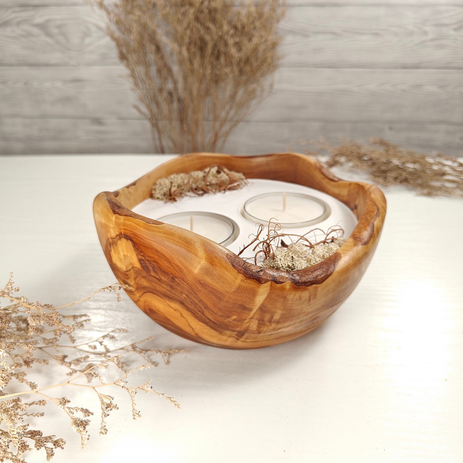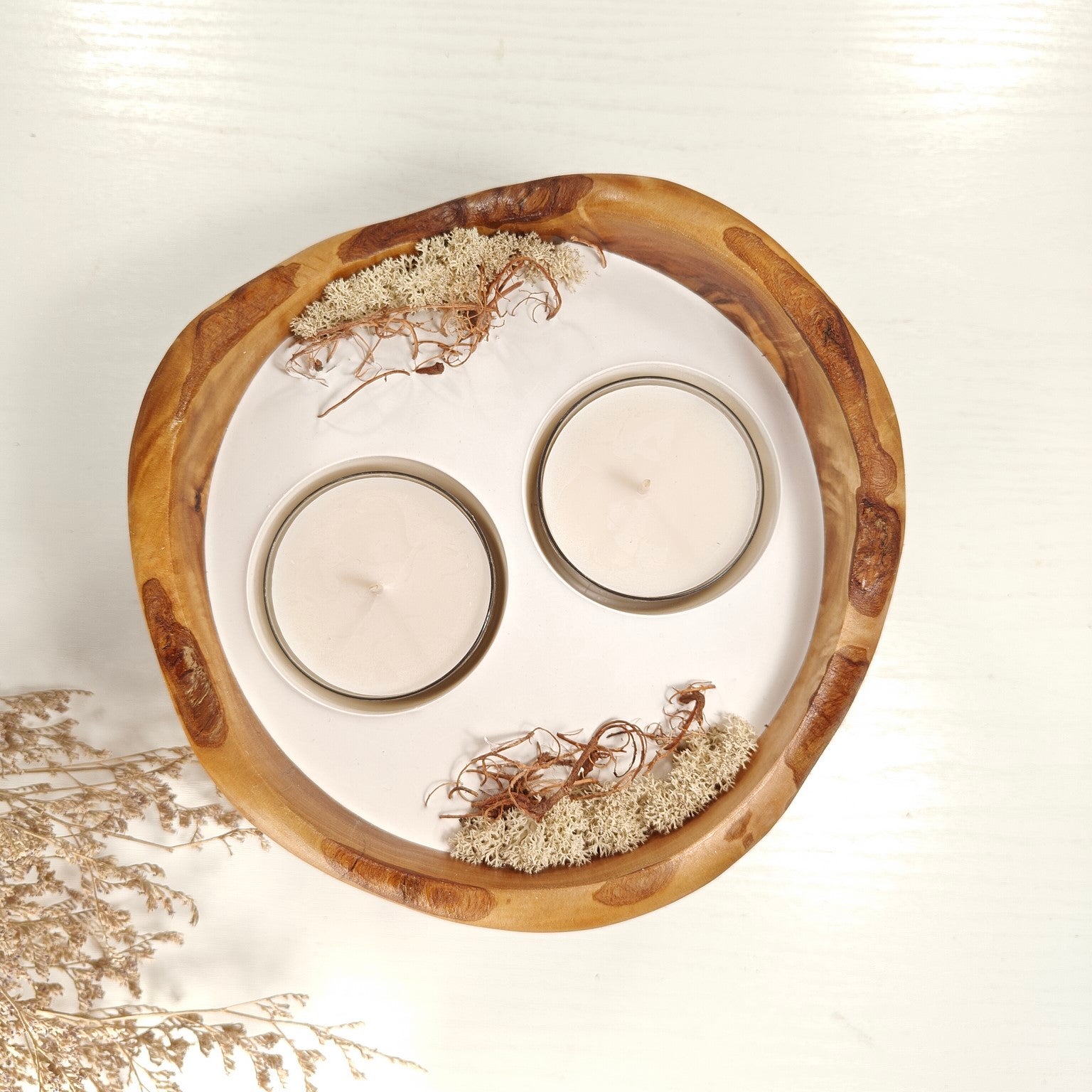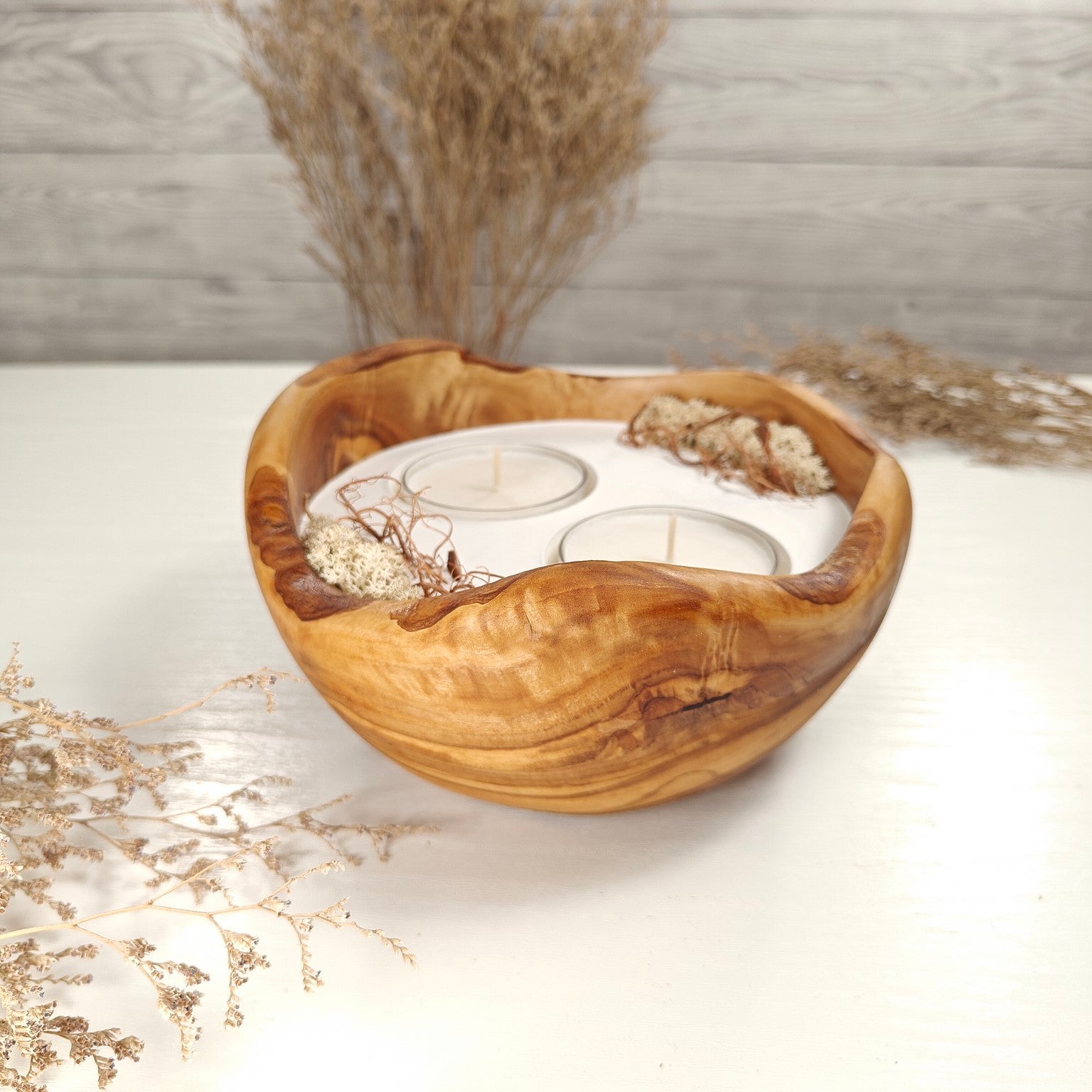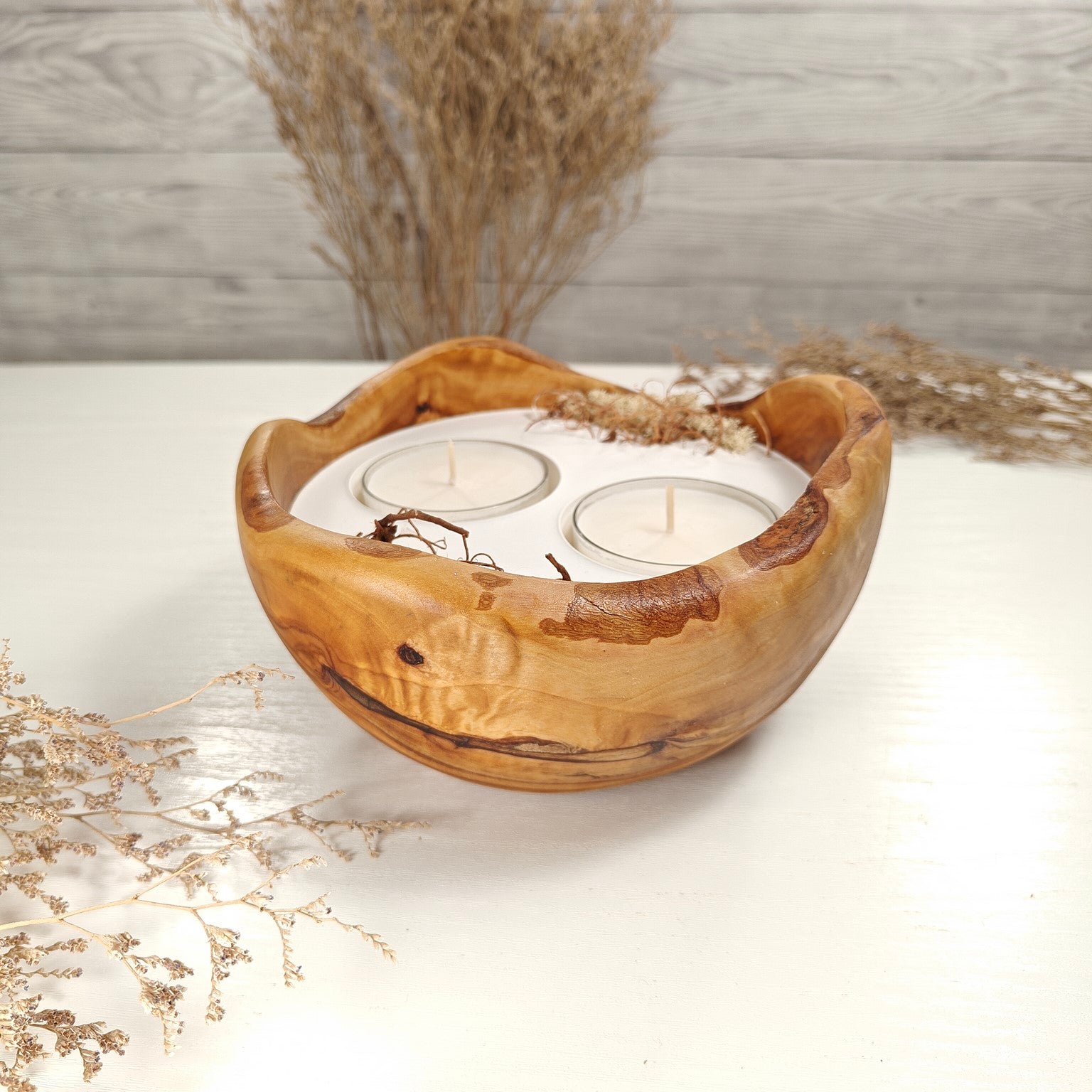 Unsere Olivenholzschalen für Teelichter sind die perfekte Geschenkidee.  Das charaktervolle Olivenholz, verbunden mit weissem Guss-Keramik ergibt einen schönen Farbkontrast und lässt die Kerze durch die weisse Fläche noch heller erscheinen. Jede Kerze ist ein Unikat und einzigartiges Geschenk.