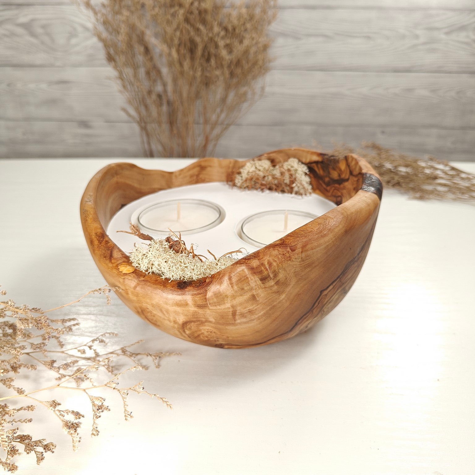 Unsere Olivenholzschalen für Teelichter sind die perfekte Geschenkidee.  Das charaktervolle Olivenholz, verbunden mit weissem Guss-Keramik ergibt einen schönen Farbkontrast und lässt die Kerze durch die weisse Fläche noch heller erscheinen. Jede Kerze ist ein Unikat und einzigartiges Geschenk.