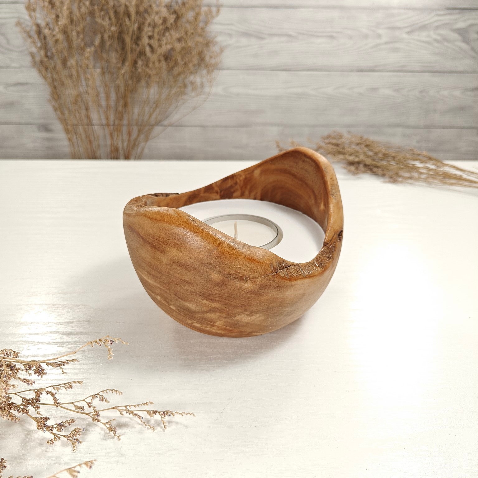 Unsere Olivenholzschalen für Teelichter sind zu Beginn mit einem Teelicht ausgestattet. Hierfür nutzen wir reine Rapswachs-Teelichter.