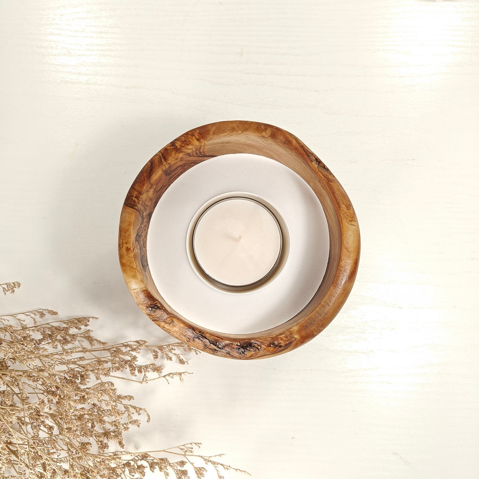 Unsere Olivenholzschalen für Teelichter sind die perfekte Geschenkidee.  Das charaktervolle Olivenholz, verbunden mit weissem Guss-Keramik ergibt einen schönen Farbkontrast und lässt die Kerze durch die weisse Fläche noch heller erscheinen. Jede Kerze ist ein Unikat und einzigartiges Geschenk.