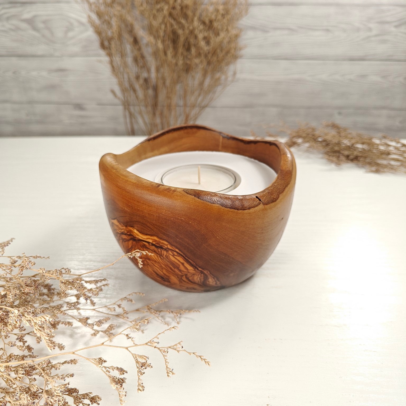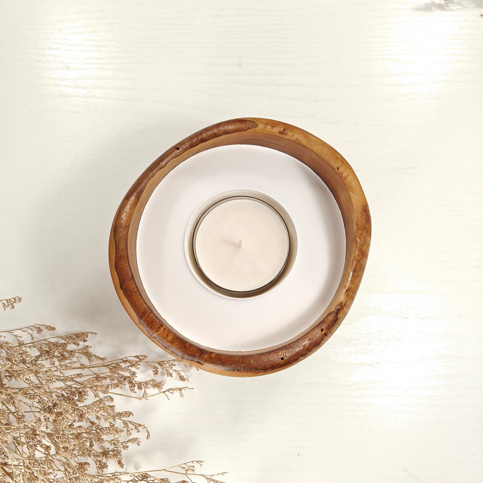 Unsere Olivenholzschalen für Teelichter sind die perfekte Geschenkidee.  Das charaktervolle Olivenholz, verbunden mit weissem Guss-Keramik ergibt einen schönen Farbkontrast und lässt die Kerze durch die weisse Fläche noch heller erscheinen. Jede Kerze ist ein Unikat und einzigartiges Geschenk.