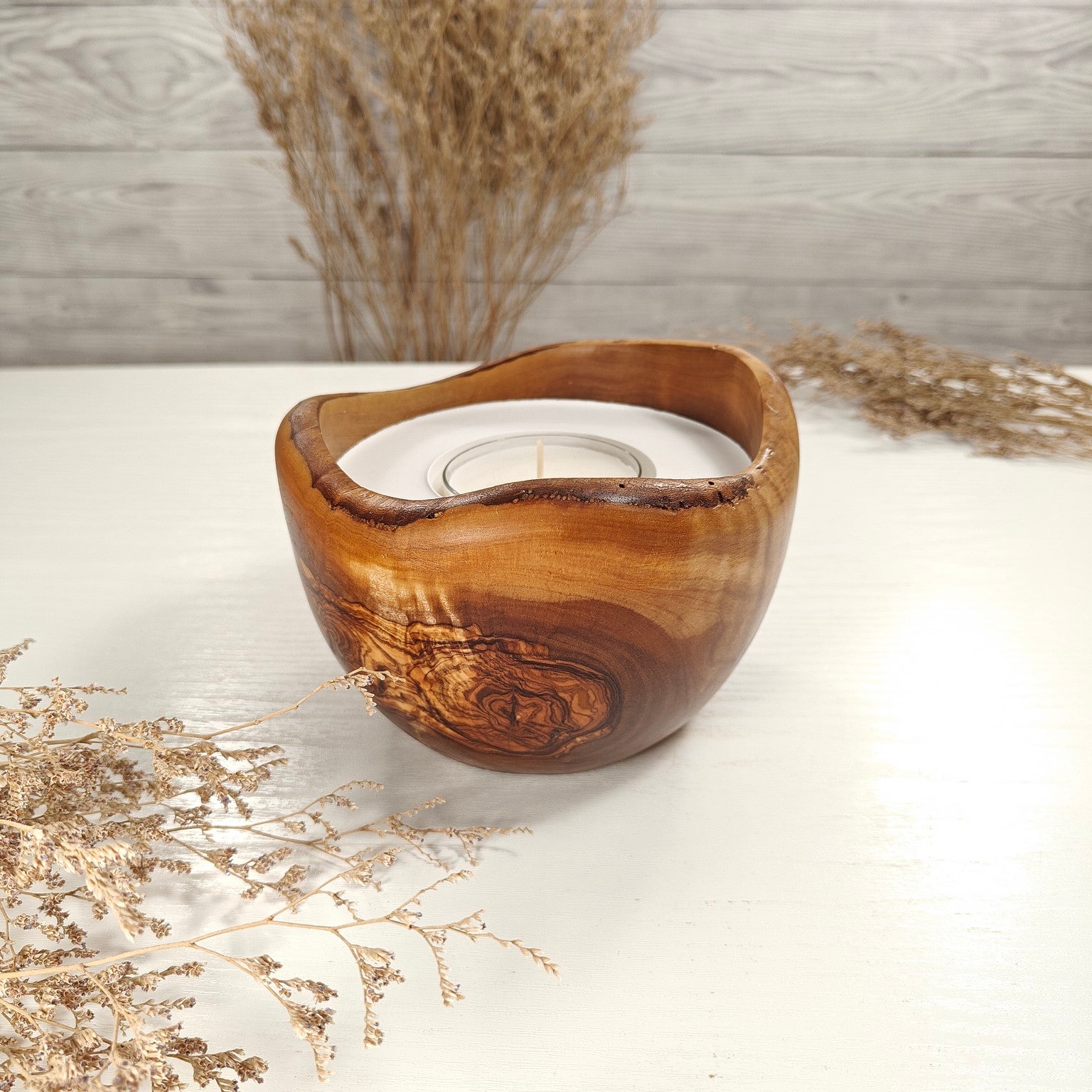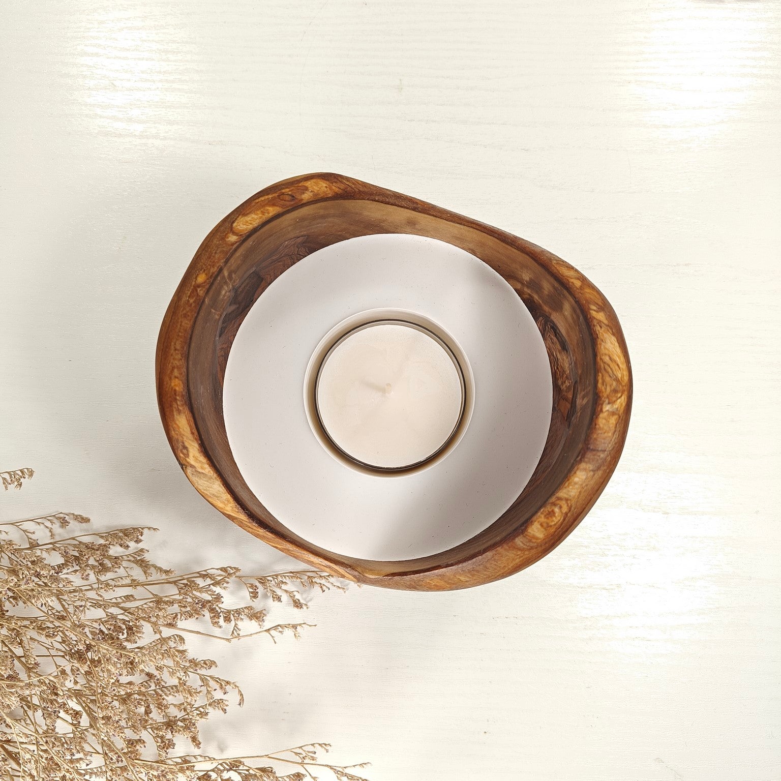Unsere Olivenholzschalen für Teelichter sind die perfekte Geschenkidee.  Das charaktervolle Olivenholz, verbunden mit weissem Guss-Keramik ergibt einen schönen Farbkontrast und lässt die Kerze durch die weisse Fläche noch heller erscheinen. Jede Kerze ist ein Unikat und einzigartiges Geschenk.
