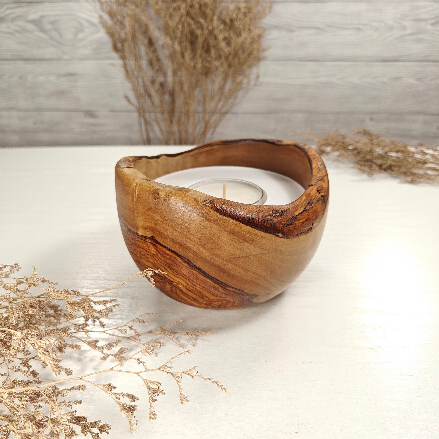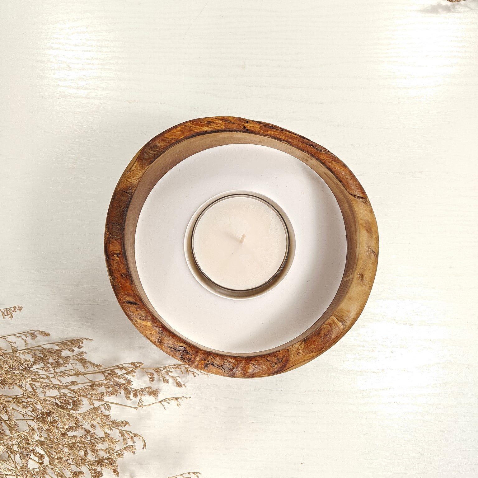 Unsere Olivenholzschalen für Teelichter sind die perfekte Geschenkidee.  Das charaktervolle Olivenholz, verbunden mit weissem Guss-Keramik ergibt einen schönen Farbkontrast und lässt die Kerze durch die weisse Fläche noch heller erscheinen. Jede Kerze ist ein Unikat und einzigartiges Geschenk.