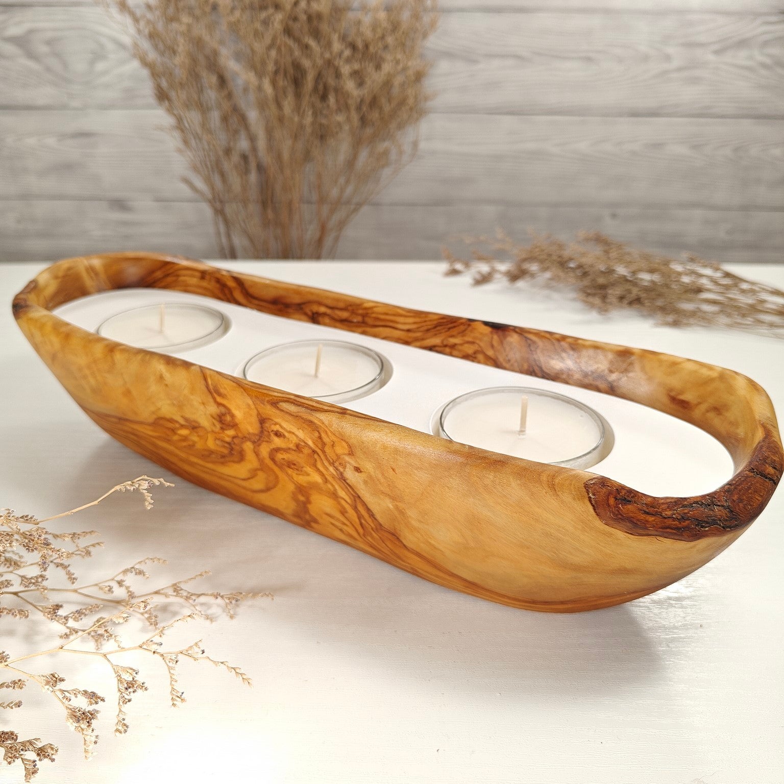 Teelicht-Kerze in Olivenholz-Boot, BRTC-L-00010, L 29cm, 60mm Teelicht