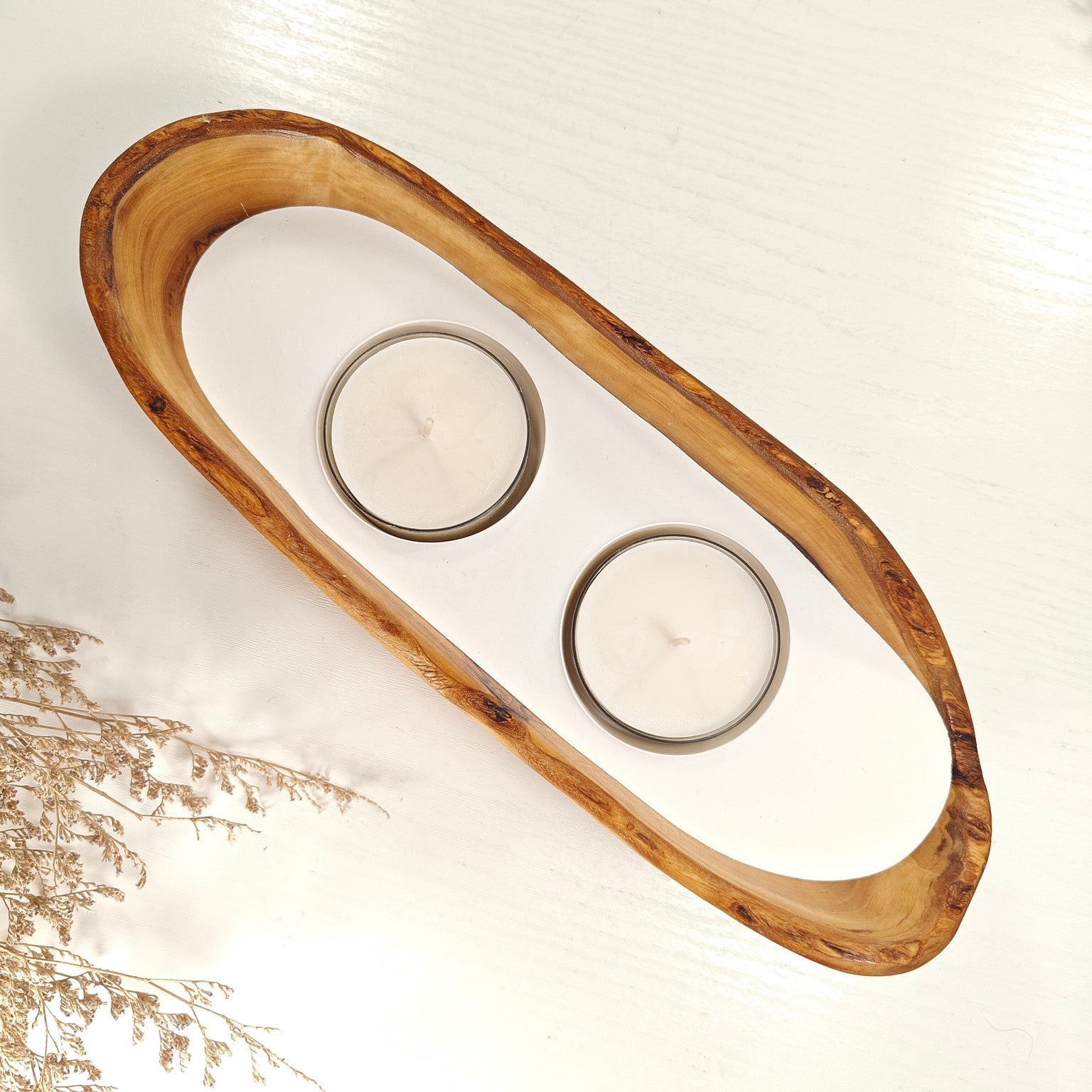 Unsere Olivenholzschalen für Teelichter sind zu Beginn mit einem Teelicht ausgestattet. Hierfür nutzen wir reine Rapswachs-Teelichter.