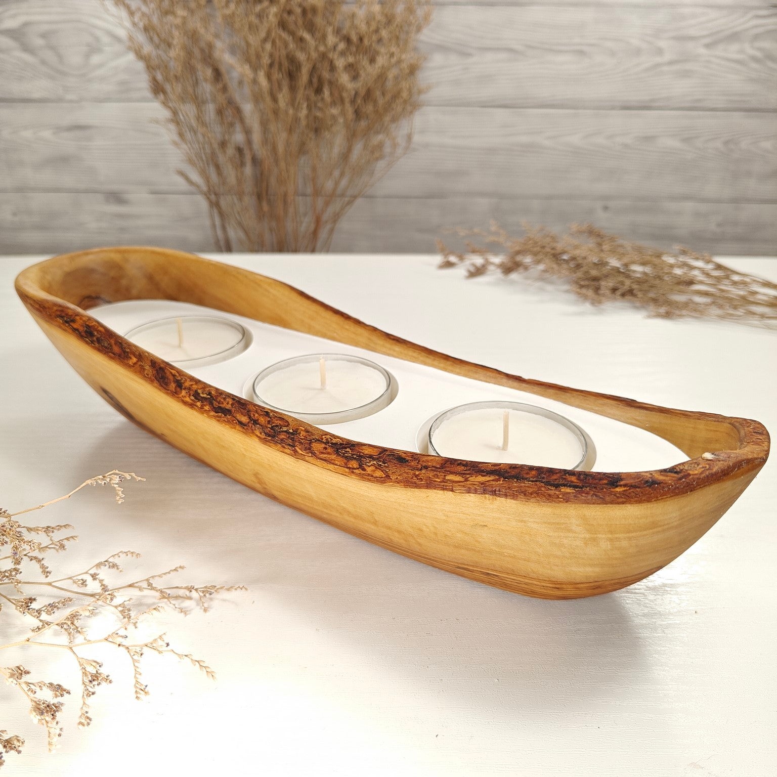 Teelicht-Kerze in Olivenholz-Boot, BRTC-L-00012, L 31cm, 60mm Teelicht