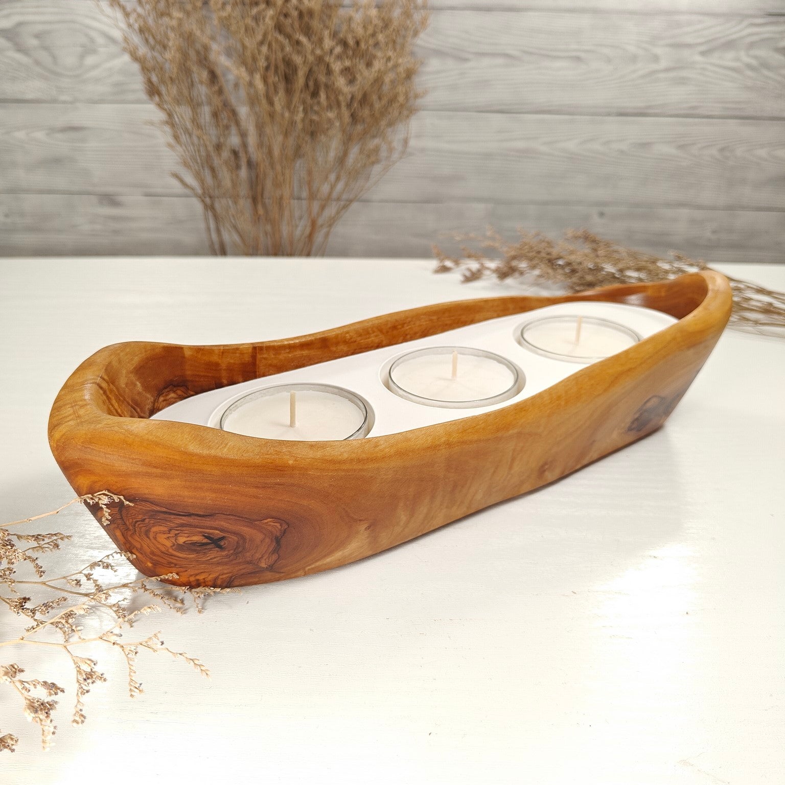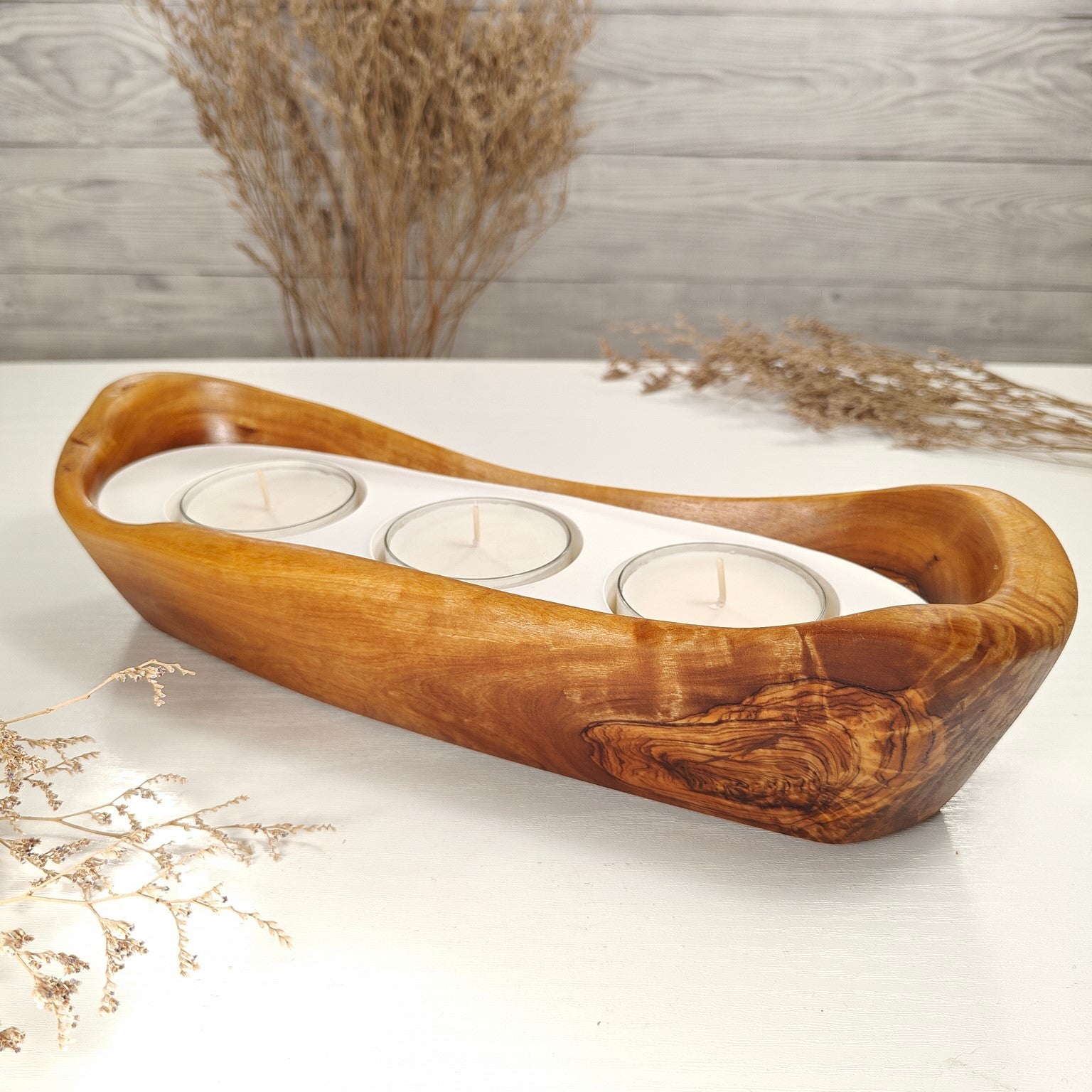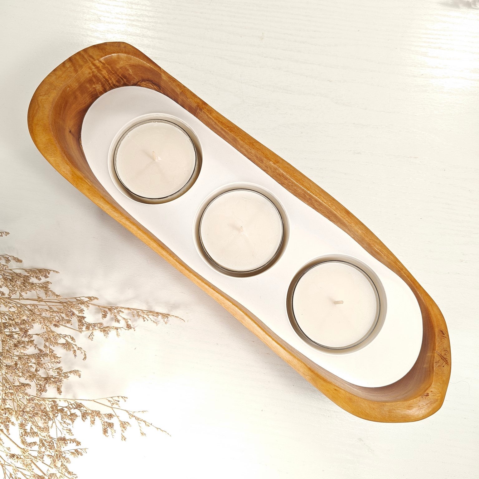 Unsere Teelichter in Olivenholzschalen sind die perfekte Geschenkidee.  Das charaktervolle Olivenholz, verbunden mit weissem Guss-Keramik ergibt einen schönen Farbkontrast und lässt die Kerze durch die weisse Fläche noch heller erscheinen. Jede Kerze ist ein Unikat und einzigartiges Geschenk.