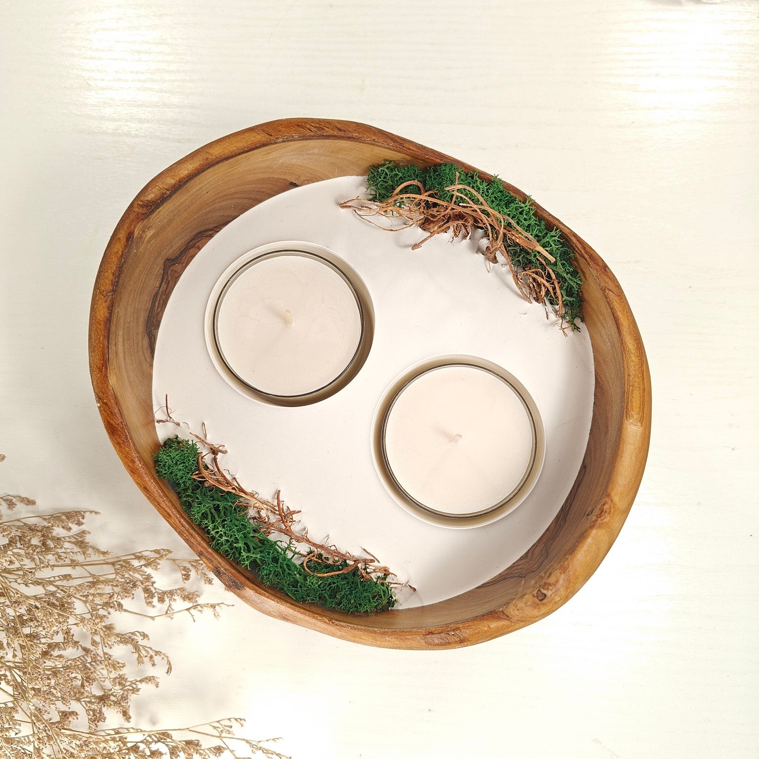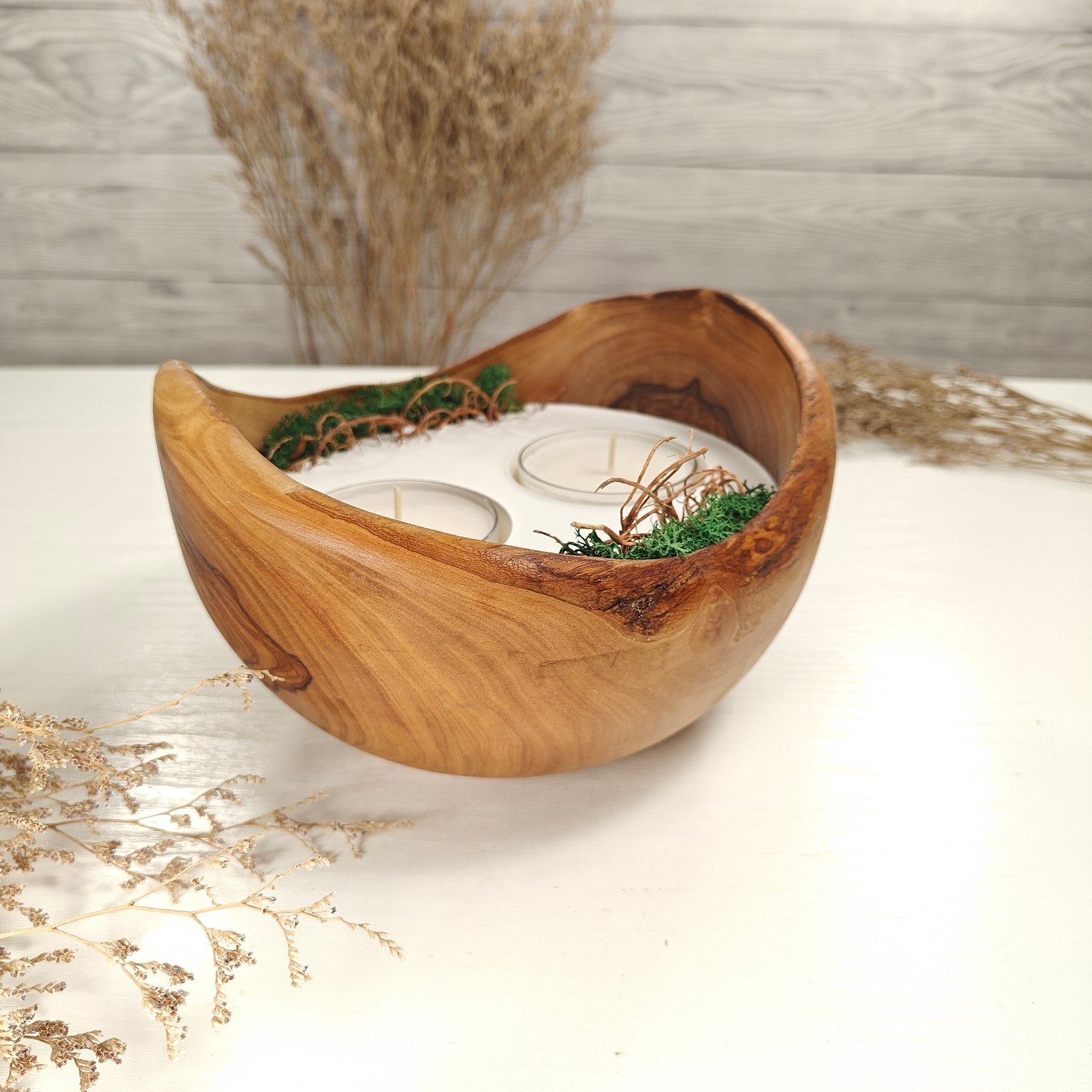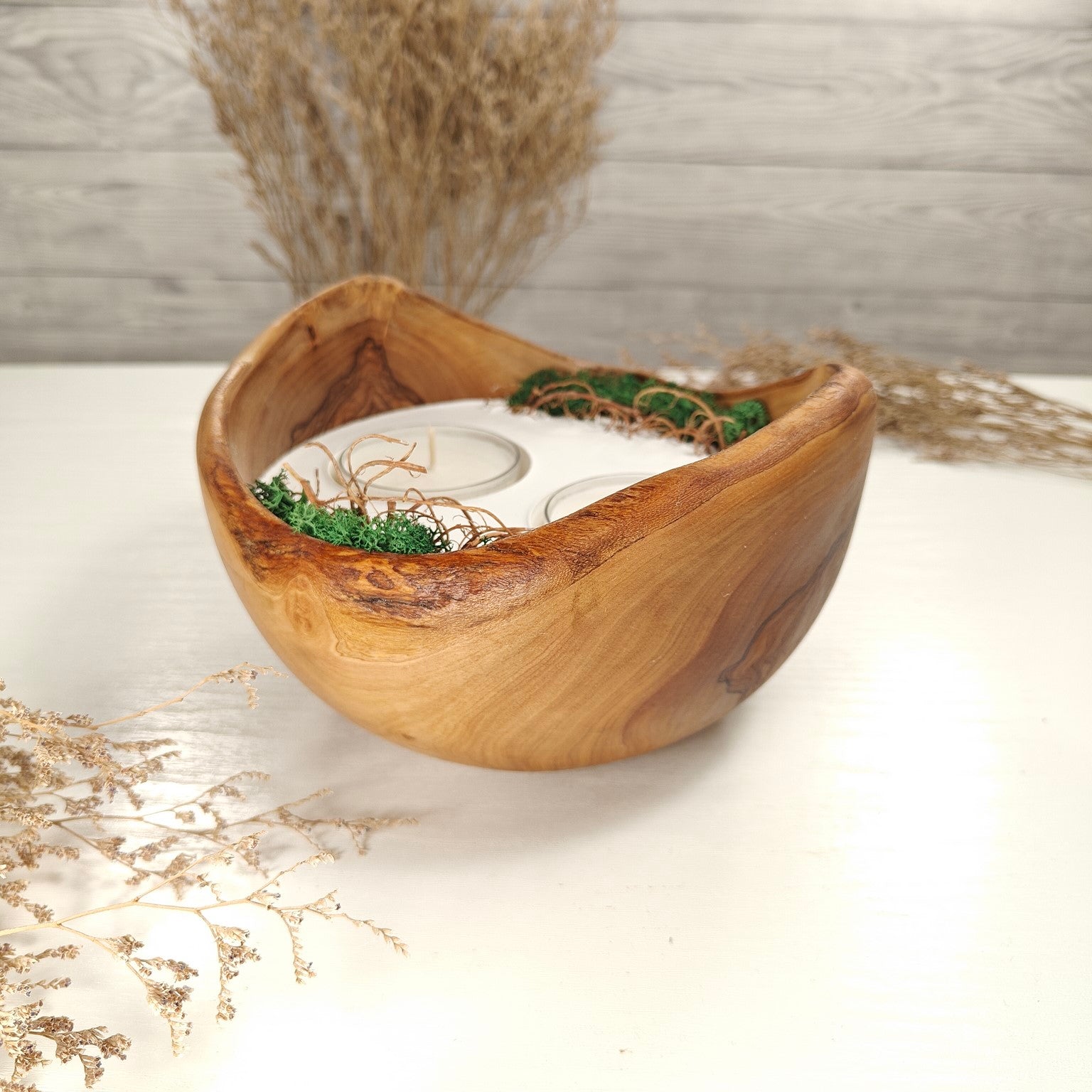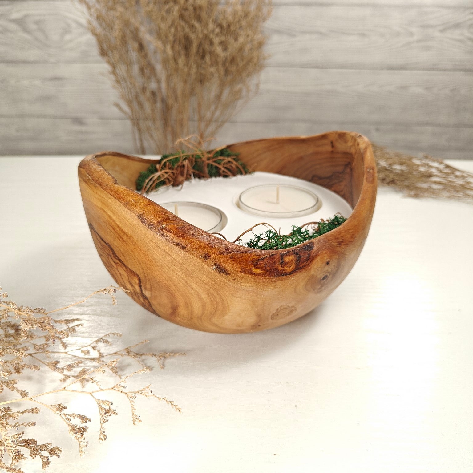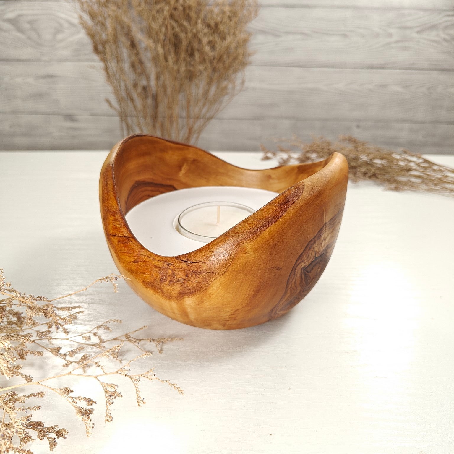 Unsere Olivenholzschalen für Teelichter sind die perfekte Geschenkidee.  Das charaktervolle Olivenholz, verbunden mit weissem Guss-Keramik ergibt einen schönen Farbkontrast und lässt die Kerze durch die weisse Fläche noch heller erscheinen. Jede Kerze ist ein Unikat und einzigartiges Geschenk.