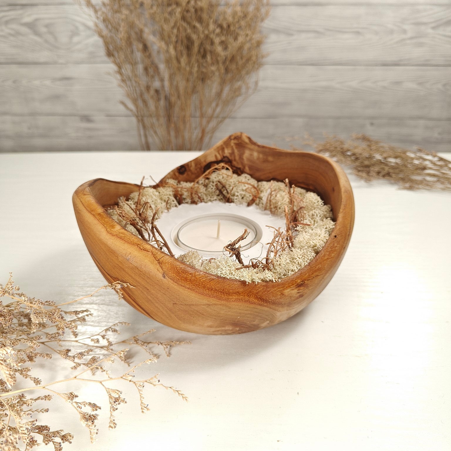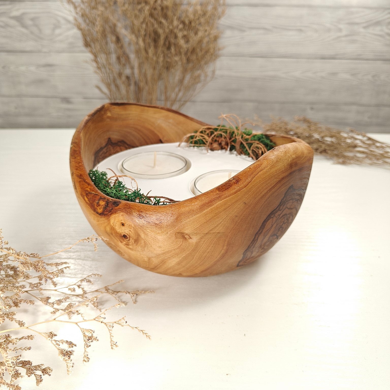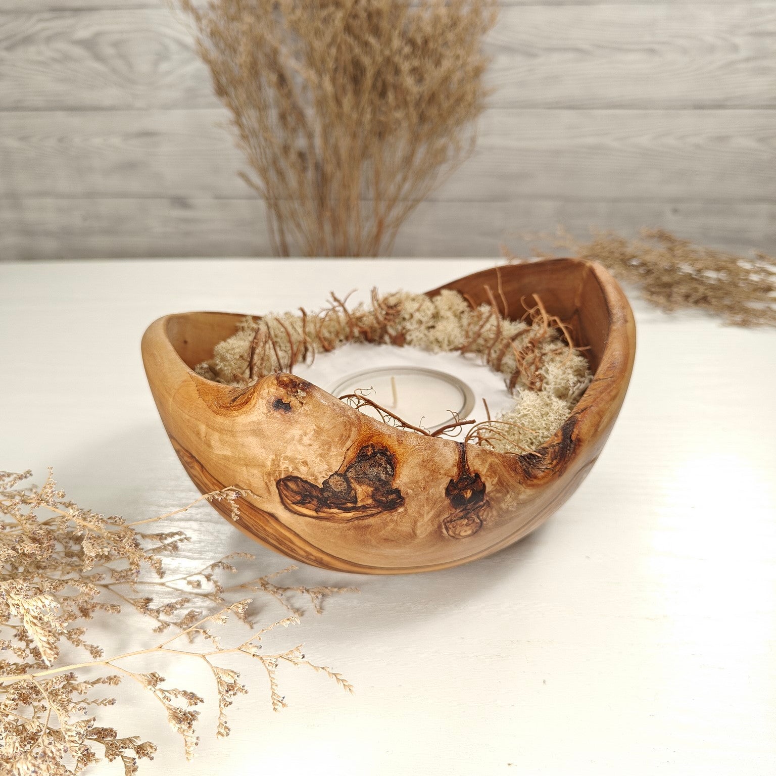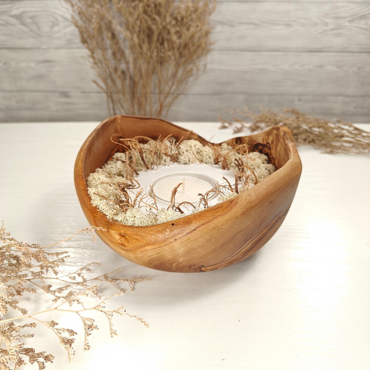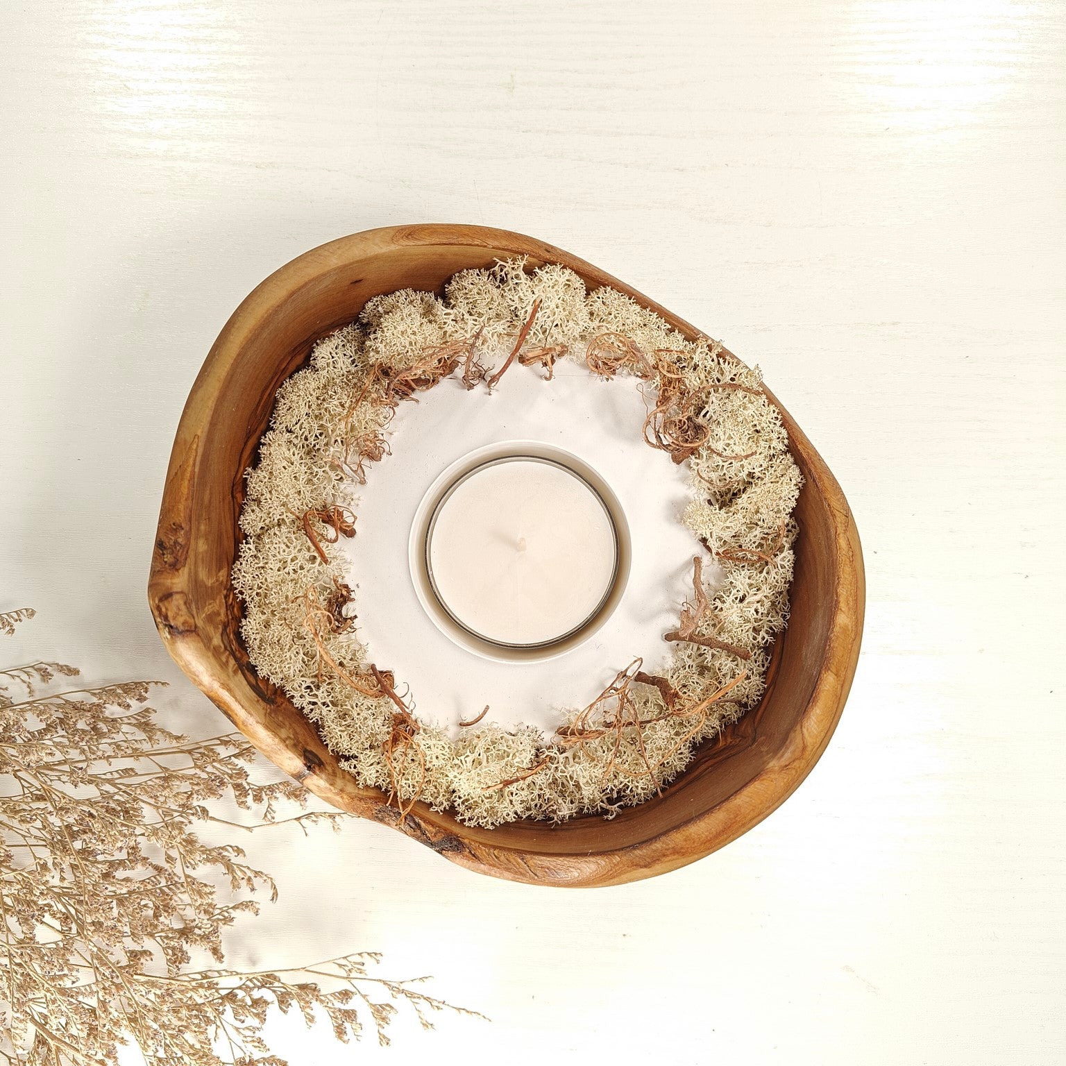 Unsere Olivenholzschalen für Teelichter sind die perfekte Geschenkidee.  Das charaktervolle Olivenholz, verbunden mit weissem Guss-Keramik ergibt einen schönen Farbkontrast und lässt die Kerze durch die weisse Fläche noch heller erscheinen. Jede Kerze ist ein Unikat und einzigartiges Geschenk.