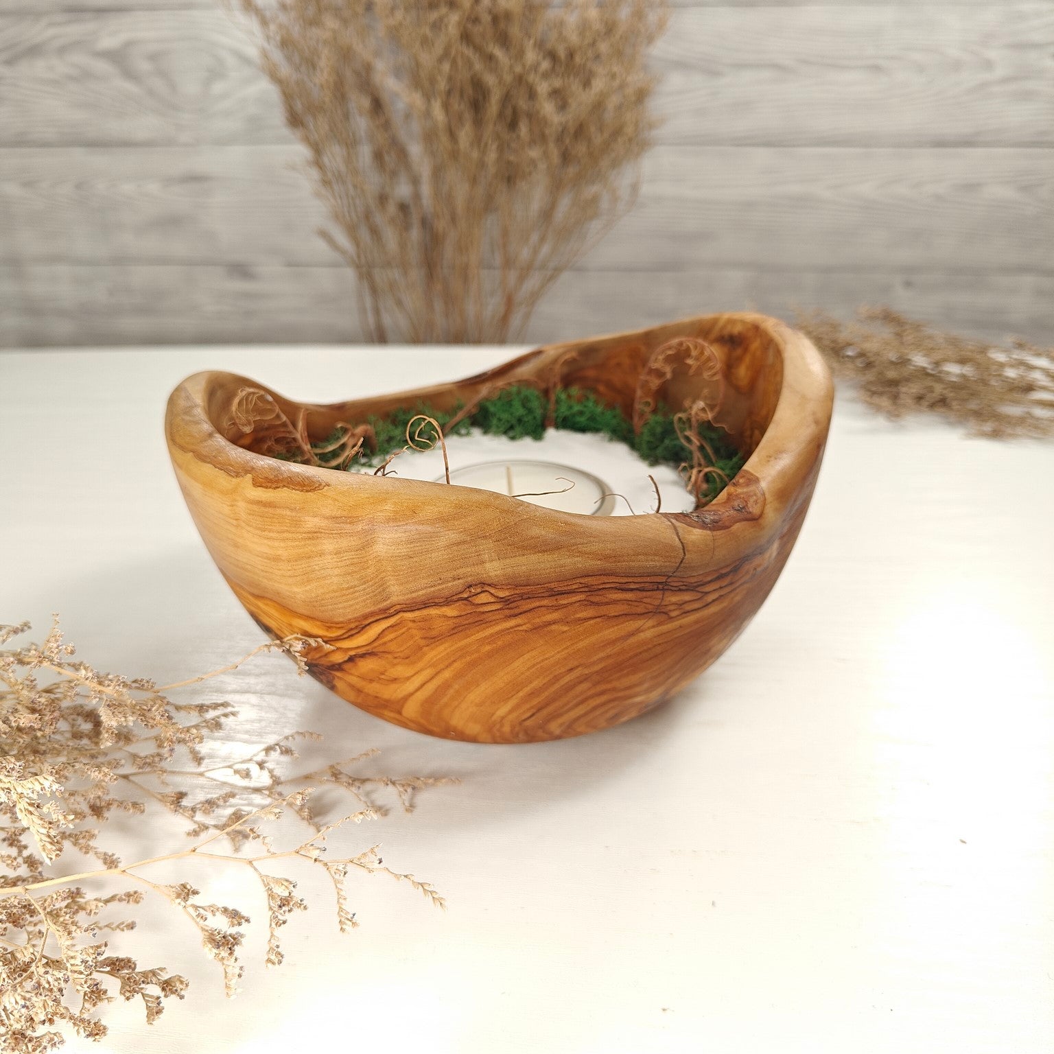 Unsere Olivenholzschalen für Teelichter sind die perfekte Geschenkidee.  Das charaktervolle Olivenholz, verbunden mit weissem Guss-Keramik ergibt einen schönen Farbkontrast und lässt die Kerze durch die weisse Fläche noch heller erscheinen. Jede Kerze ist ein Unikat und einzigartiges Geschenk.