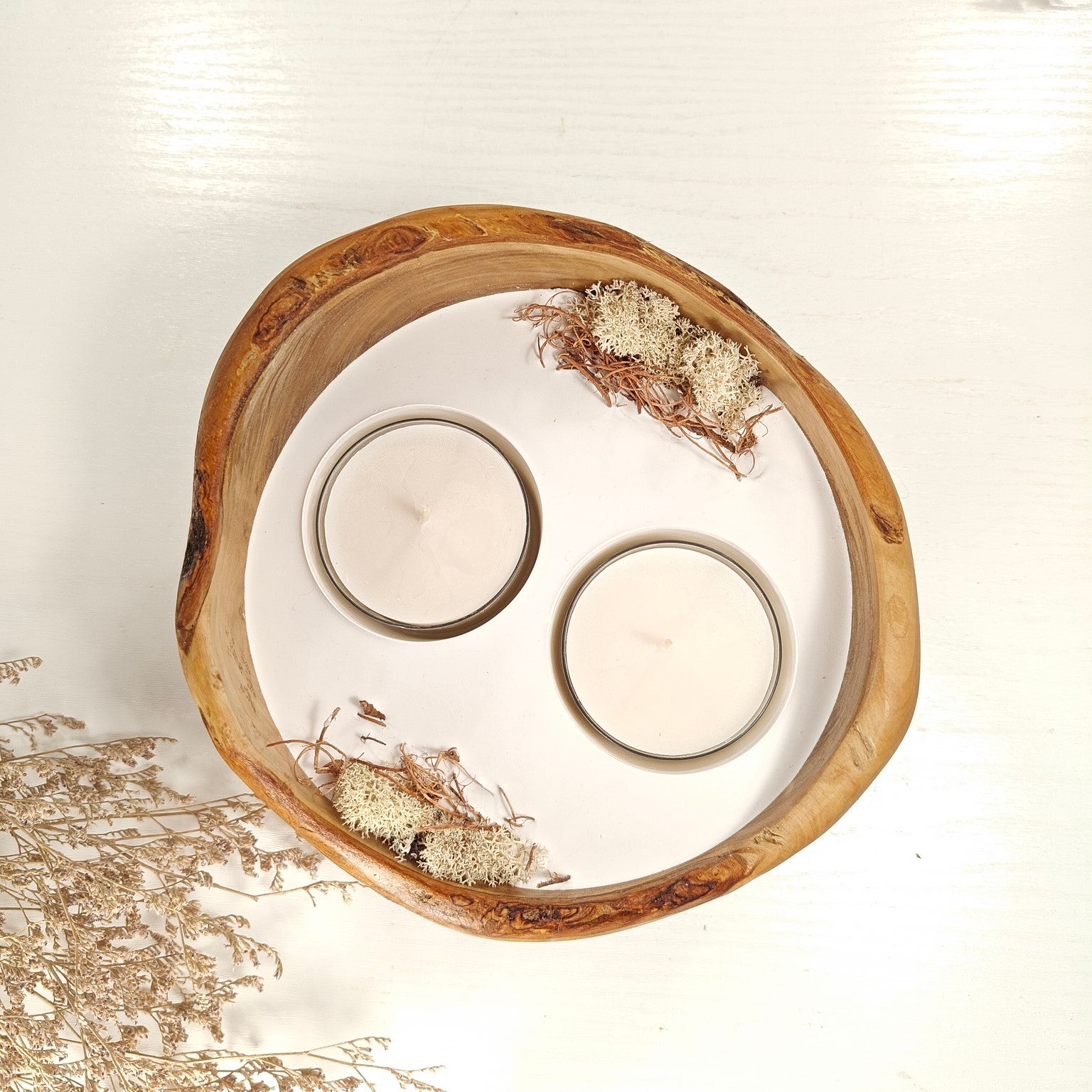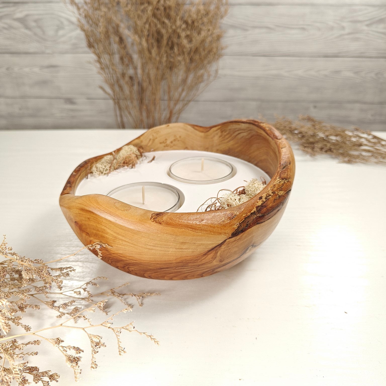 Unsere Olivenholzschalen für Teelichter sind die perfekte Geschenkidee.  Das charaktervolle Olivenholz, verbunden mit weissem Guss-Keramik ergibt einen schönen Farbkontrast und lässt die Kerze durch die weisse Fläche noch heller erscheinen. Jede Kerze ist ein Unikat und einzigartiges Geschenk.
