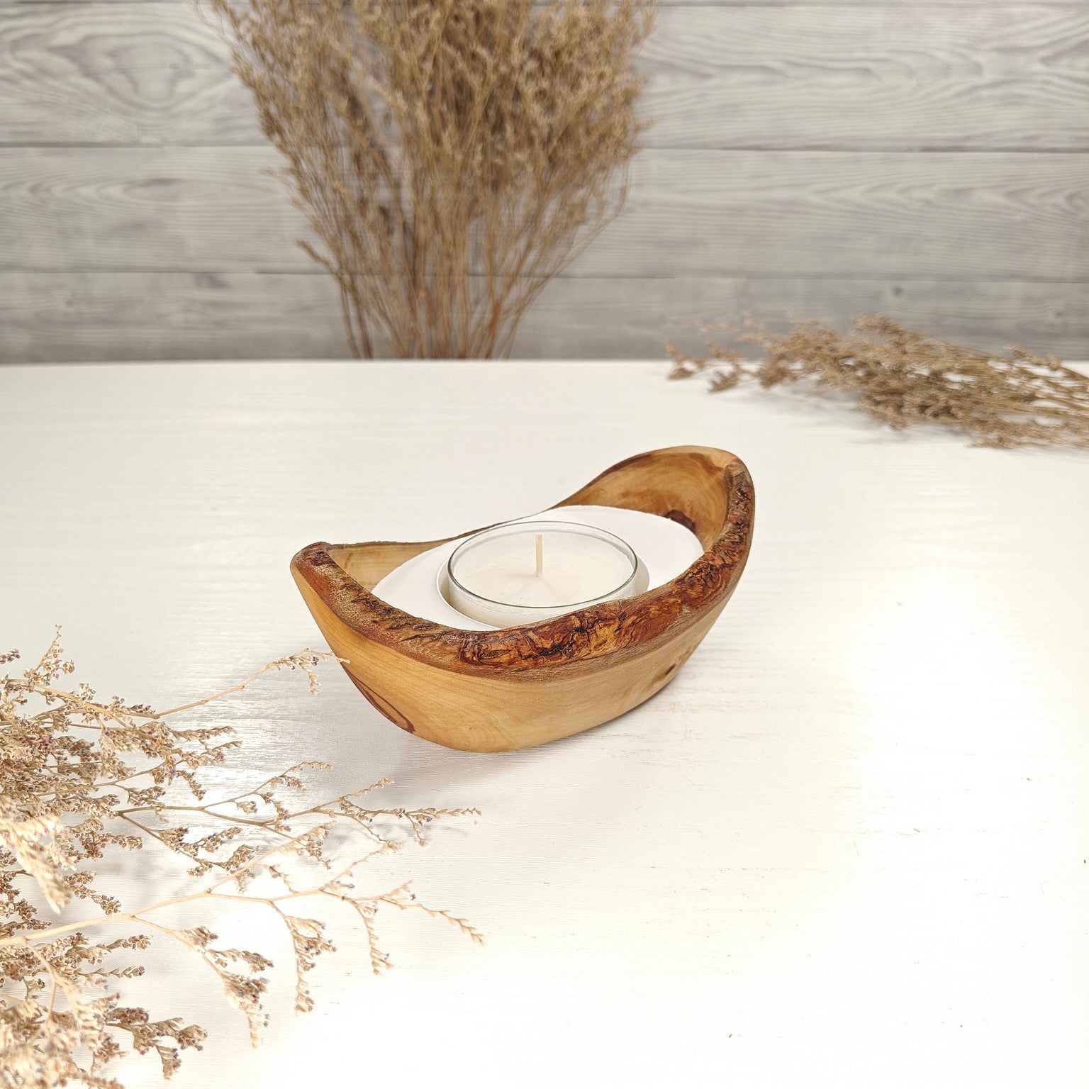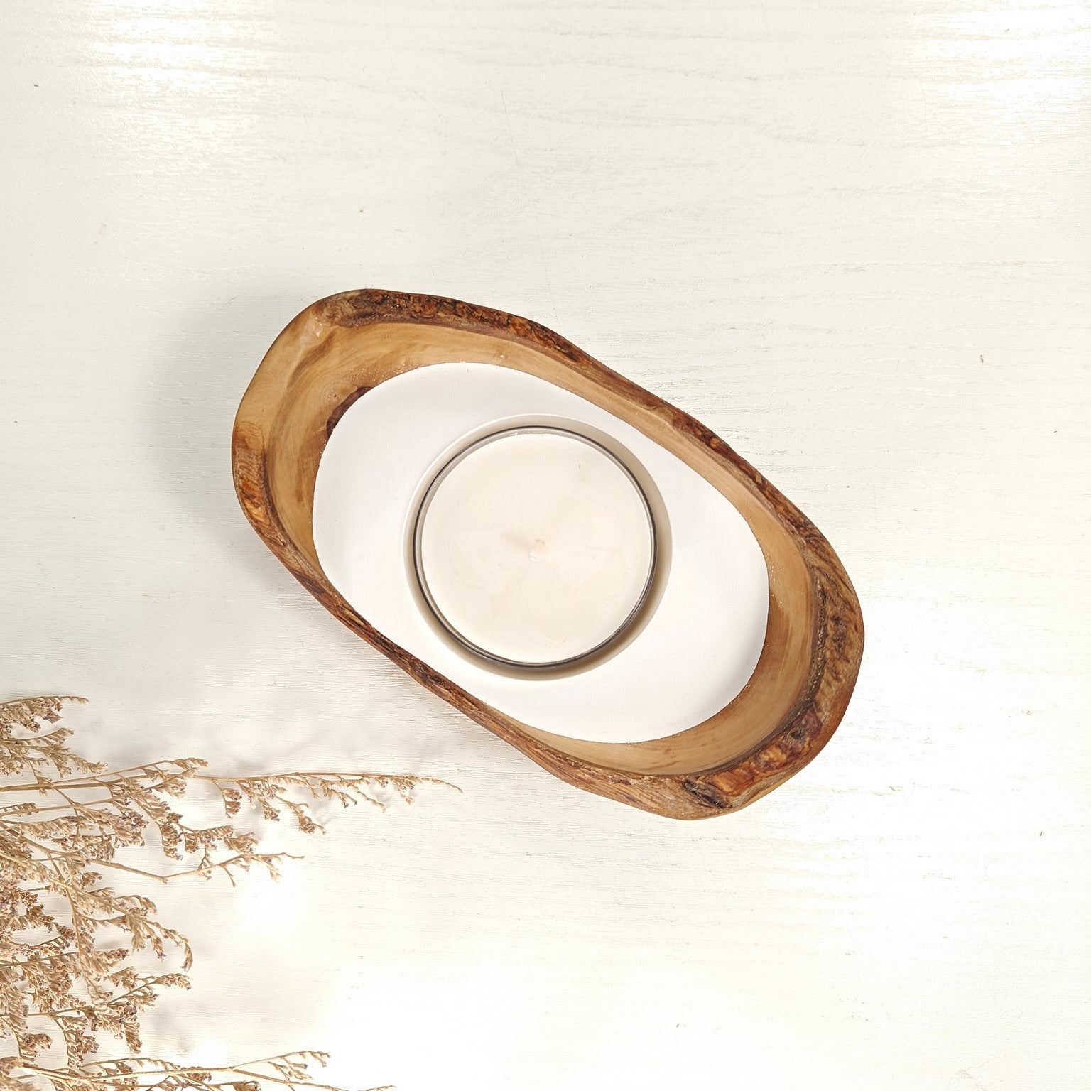 Unsere Teelichter in Olivenholzschalen sind die perfekte Geschenkidee.  Das charaktervolle Olivenholz, verbunden mit weissem Guss-Keramik ergibt einen schönen Farbkontrast und lässt die Kerze durch die weisse Fläche noch heller erscheinen. Jede Kerze ist ein Unikat und einzigartiges Geschenk.