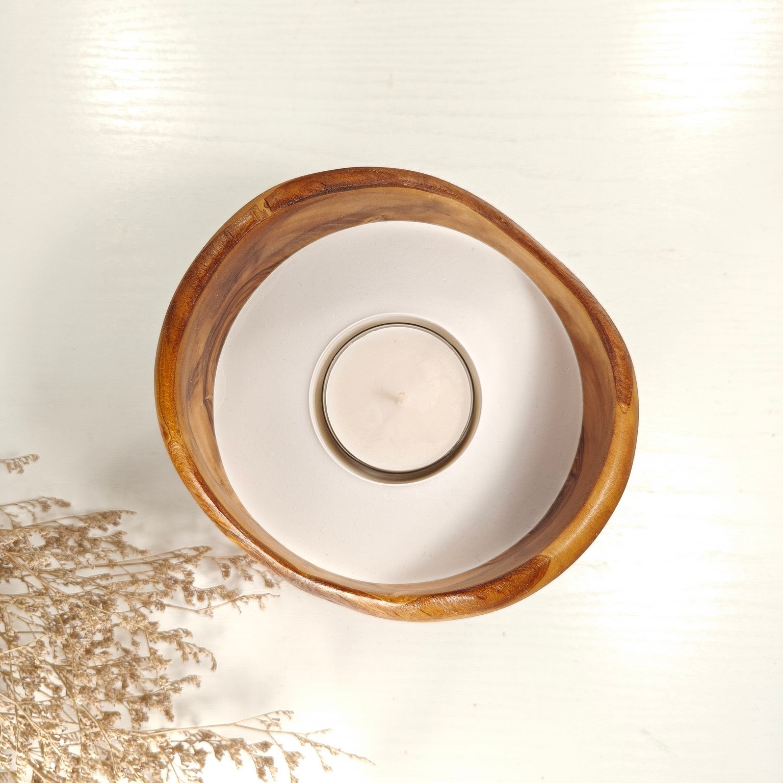 Unsere Olivenholzschalen für Teelichter sind die perfekte Geschenkidee.  Das charaktervolle Olivenholz, verbunden mit weissem Guss-Keramik ergibt einen schönen Farbkontrast und lässt die Kerze durch die weisse Fläche noch heller erscheinen. Jede Kerze ist ein Unikat und einzigartiges Geschenk.