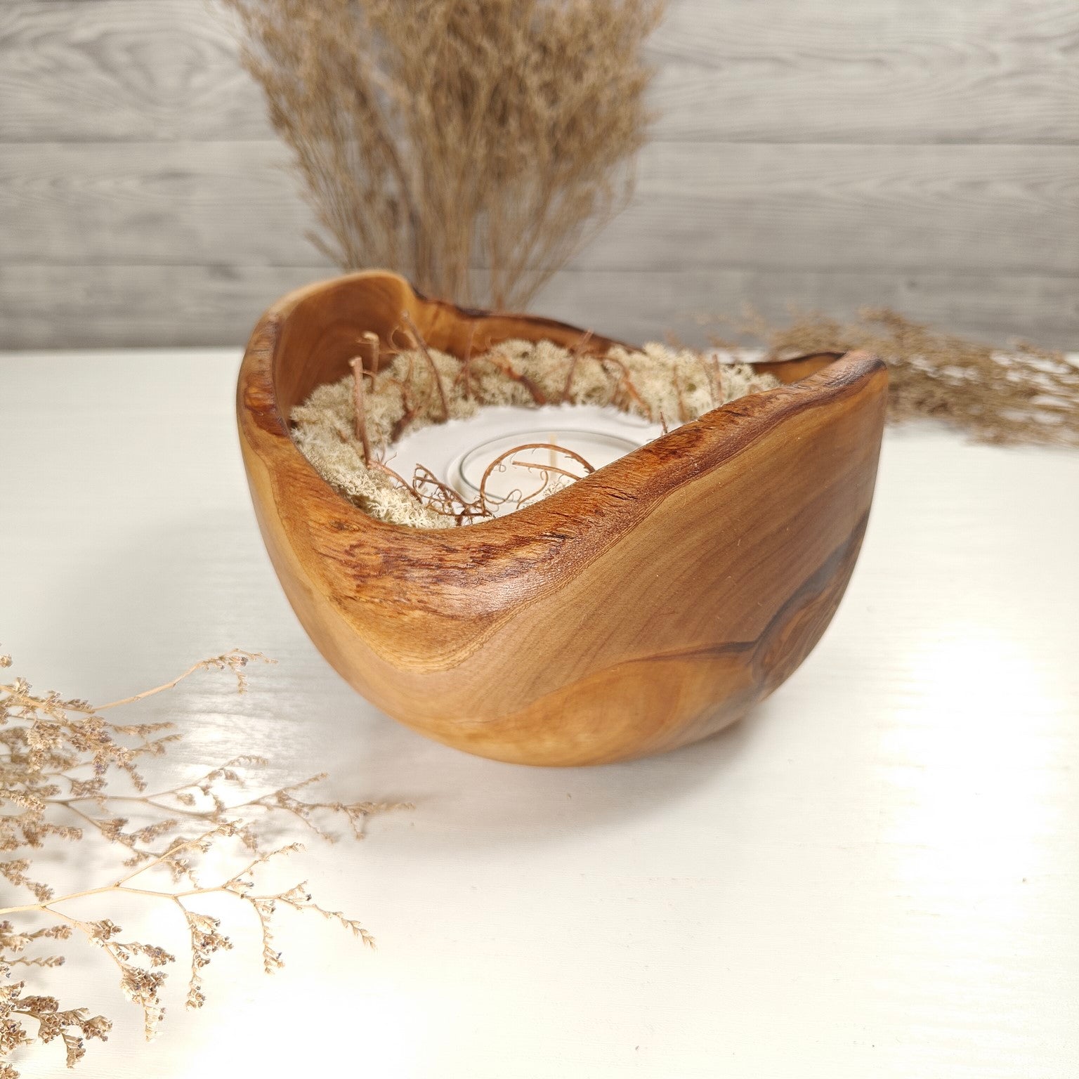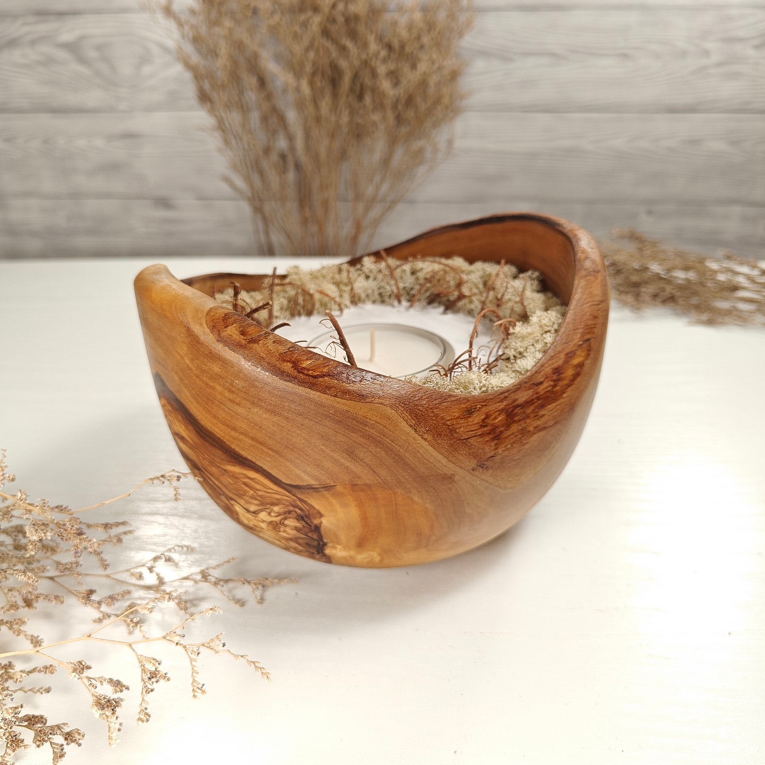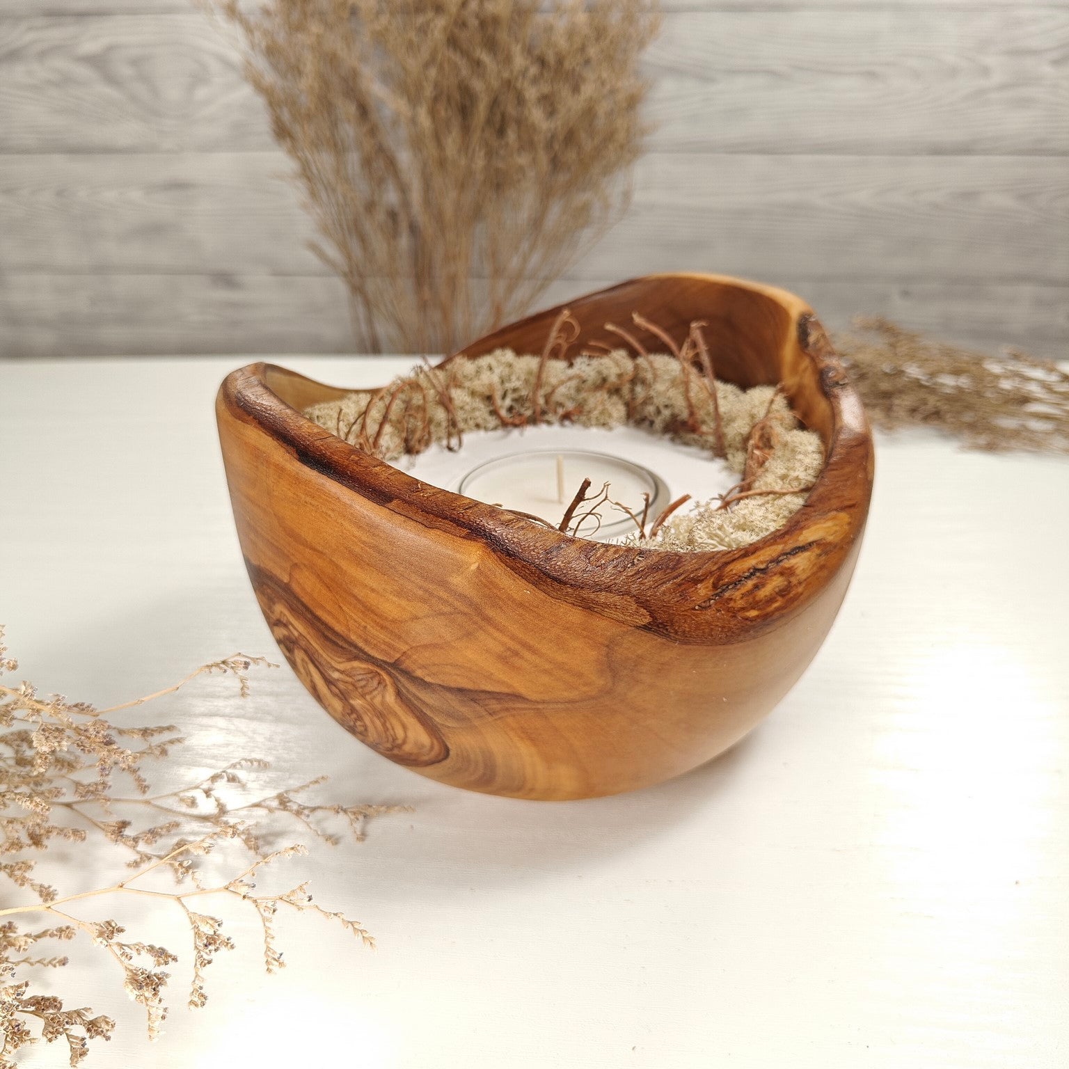 Unsere Olivenholzschalen für Teelichter sind die perfekte Geschenkidee.  Das charaktervolle Olivenholz, verbunden mit weissem Guss-Keramik ergibt einen schönen Farbkontrast und lässt die Kerze durch die weisse Fläche noch heller erscheinen. Jede Kerze ist ein Unikat und einzigartiges Geschenk.
